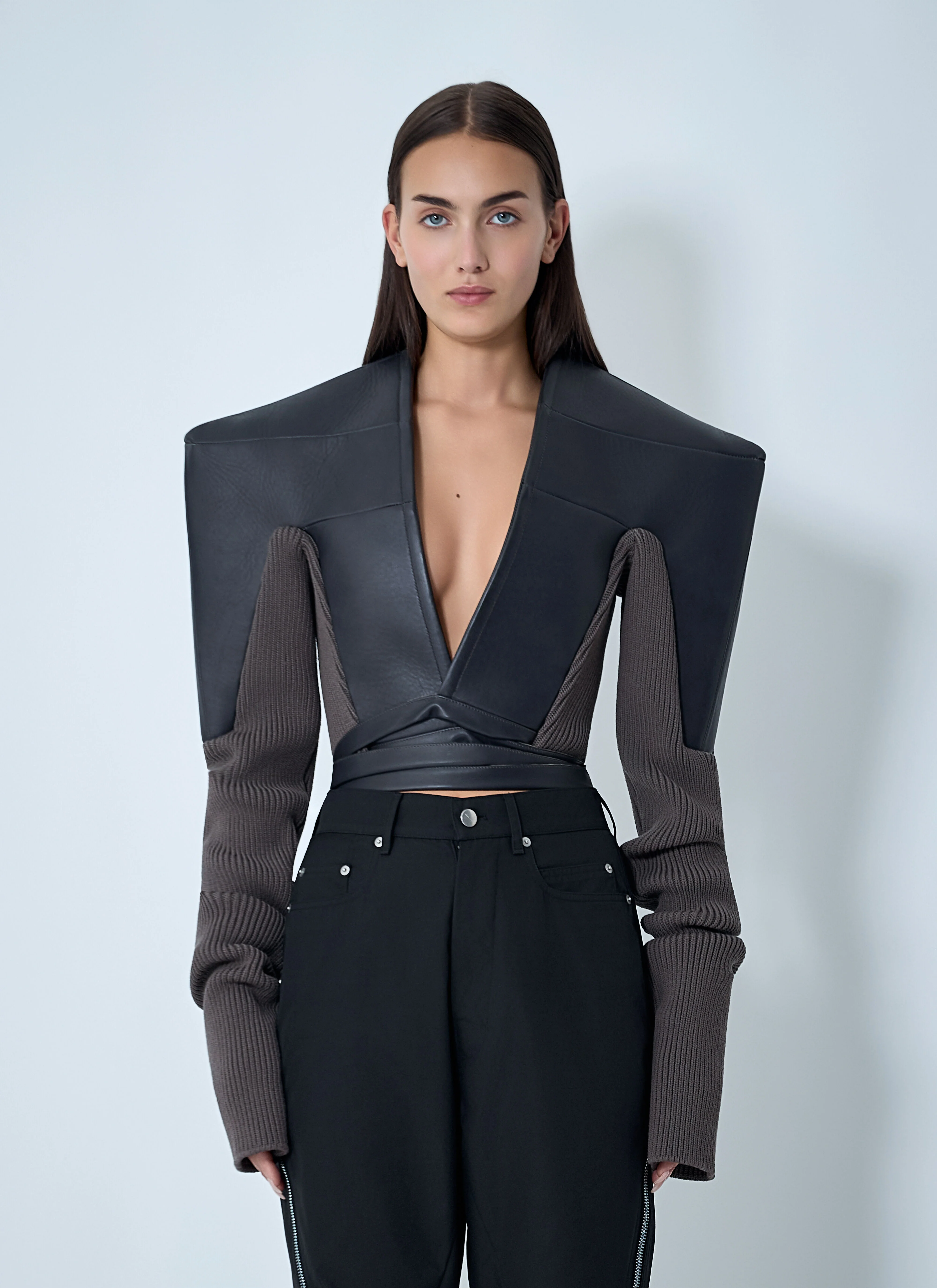 Leather jacket with contrast rib trims. - Plunge neckline - Self-tie fastening at waist - Long sleeves - Contrast panels - 100% Leather - Color: Grey - Code: RO02E4784 LOORE 78
