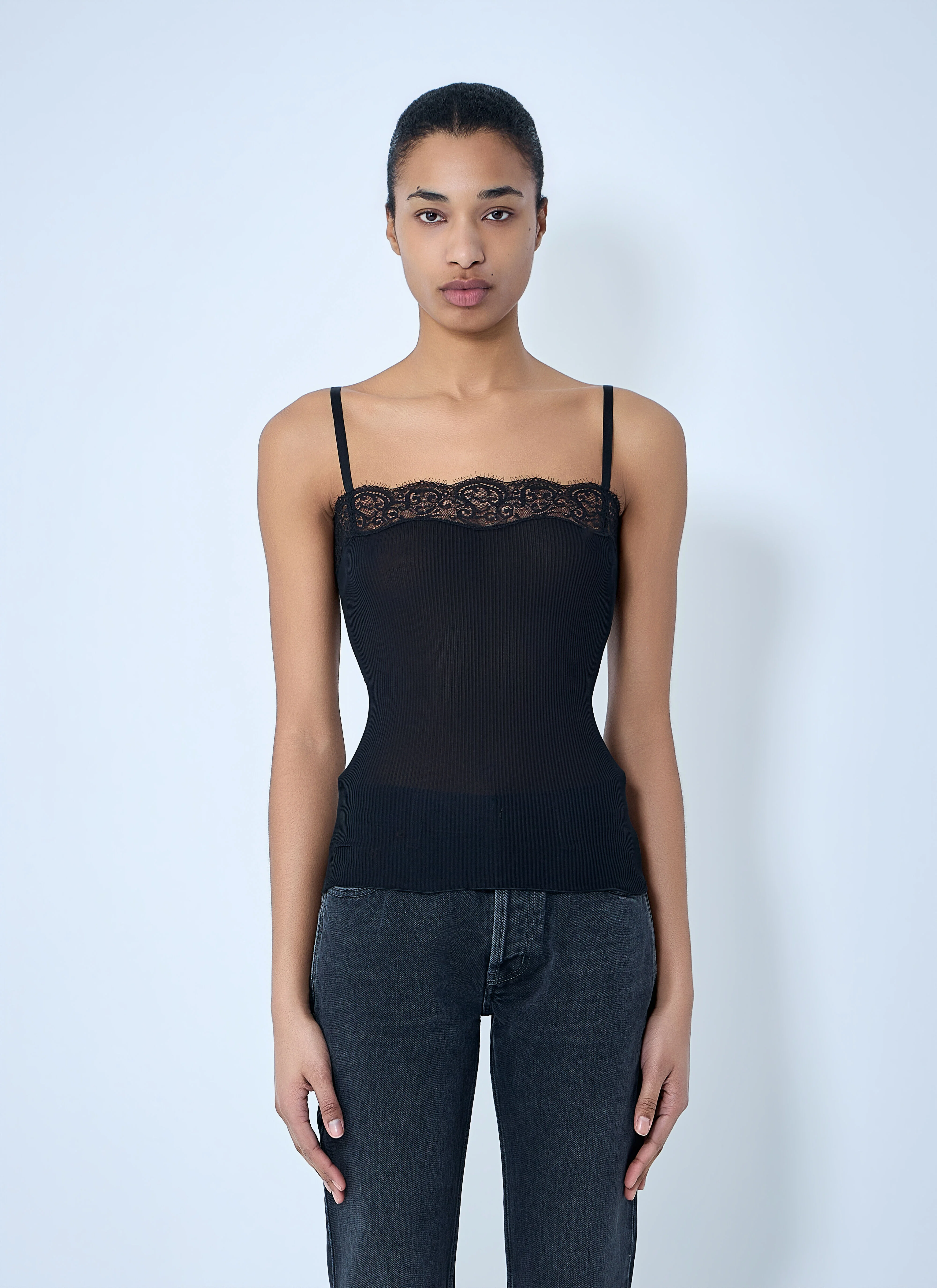 Ribbed camisole with lace trim at neckline. - Spaghetti straps - Ribbed construction - Lace trim - 100% Silk - Color: Black - Code: 859373 Y37SM 1000
