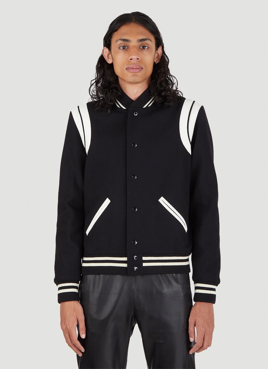 - Wool in a felt weave - Stand collar - Centre-front press-stud fastenings - Long sleeves - Elasticated cuffs - Front jet pockets - Contrast trims - Made in Italy - 100% Wool. 100% Leather. Dry clean. - Color: Black - Code: 354718 Y180W 1070