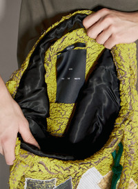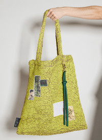 Painted Sherpa tote bag with front graphic patches. - Twin top handles - Open top - Front graphic patches - Detachable keyring - One main compartment - Made in Italy - 100% Polyester - Color: Yellow - Code: 232_BAG001_SHRPMST