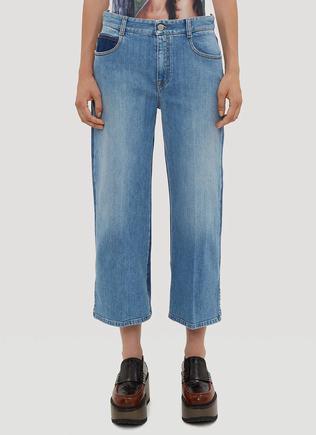 Stella continues to create beautiful everyday garments and accessories with an ethical responsibility at the core. The Cropped Panel Jeans are crafted from stretch cotton in a denim weave, featuring a two-tone panel construction, wide cropped leg and side split details. - Stretch cotton in a denim weave - Two-tone panel construction - Classic 5 pocket design - Concealed zip fly and top button fastening - Tobacco yellow top stitching - Wide cropped leg - Small side splits - Floral print pocket lining - Silver-tone hardware - Made in Italy - 98% cotton 2% Elastane. Hand wash - Color: Blue - Code: 372775SHH35 4062