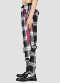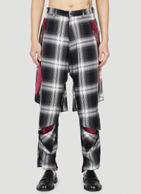 - Technical-blend fabrication in a satin weave - Mid-rise - Tailored waistband - Front button and fly fastenings - Side slip pockets - Disconstructed motif - All-over check motif - Made in Japan - 95% Rayon, 5% Silk, Lining 100% Cupro. Dry clean - Color: Black - Code: SR-P11-500 2