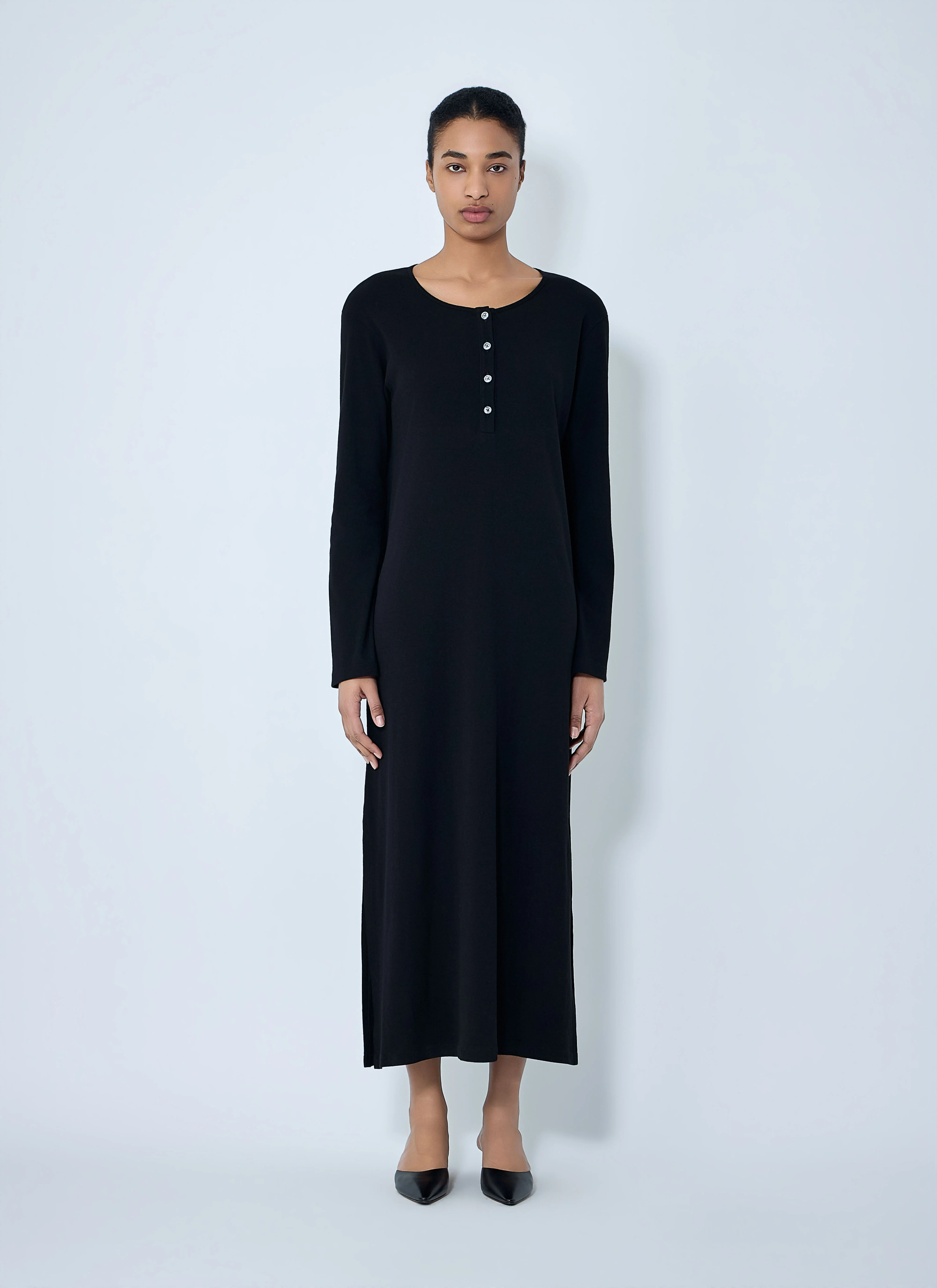 Henley maxi dress with button placket in soft jersey. - Crewneck design - Long sleeves - Button placket detail - 100% Cotton - Color: Black - Code: 10750-W3960 BLK