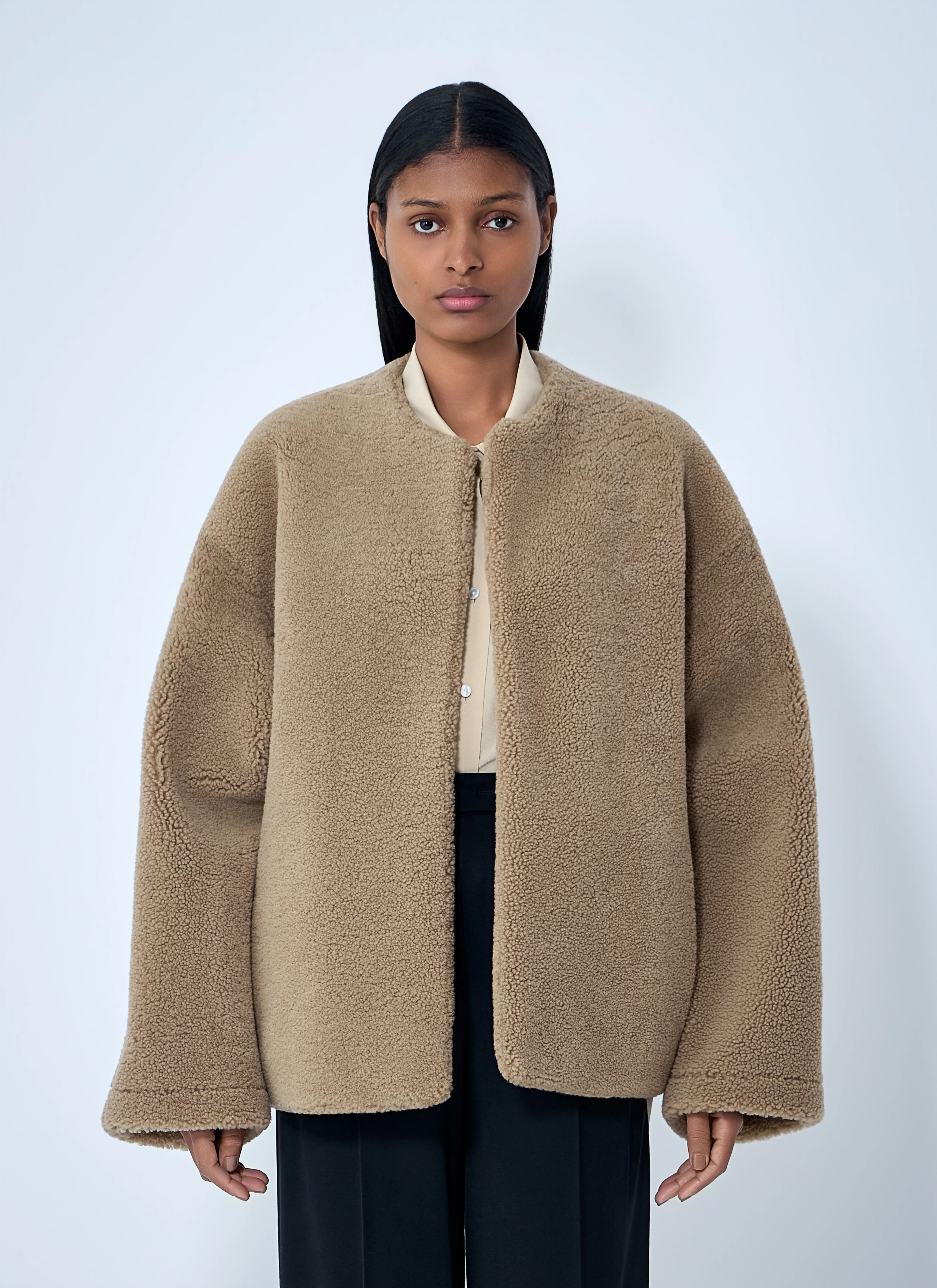 Oversized shearling jacket with concealed fastening. - Round neck - Concealed front fastening - Long sleeves - Textured finish - 100% Shearling. Specialist dry clean - Color: Beige - Code: 10536-R87-BEI