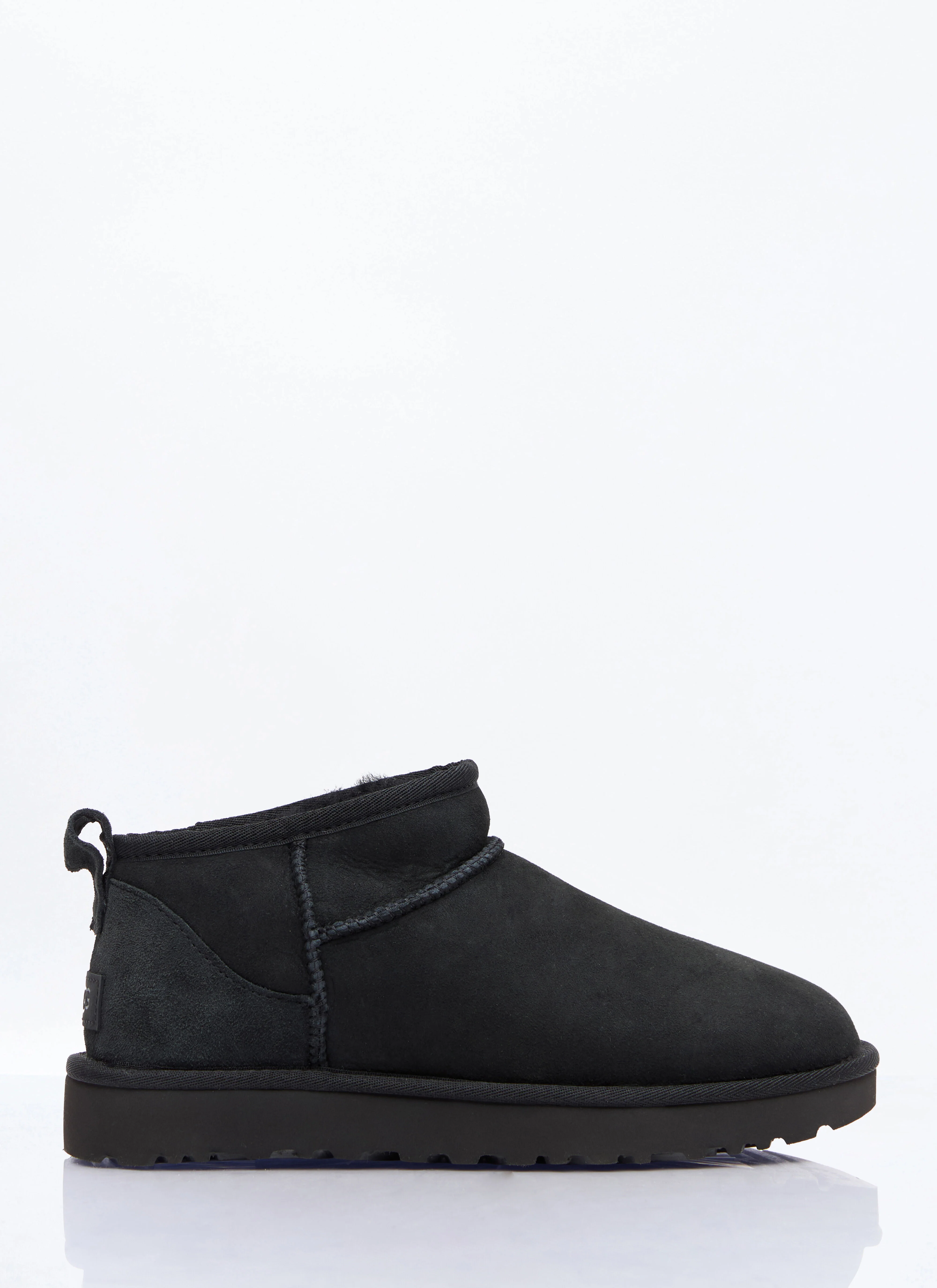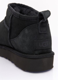 Classic Ultra Mini boots with ultra-soft UGGplush™ lining. - Round toe - Rear pull tab - Rear logo patch - Topstitching - Treadlite outsole - 80% Twinface, 20% Leather - Color: Black - Code: 1116109-BLK