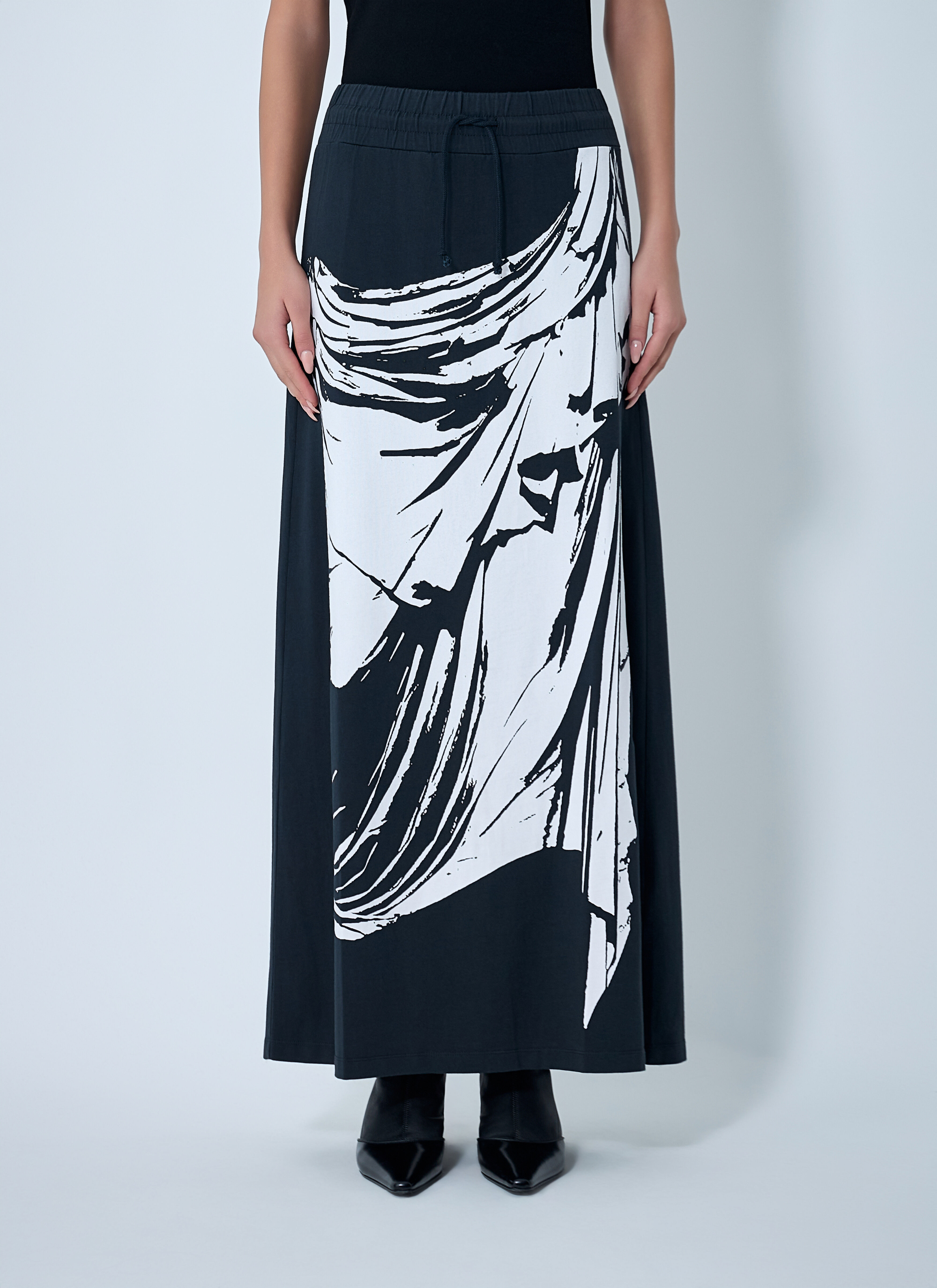 Jersey maxi skirt with a drawstring waistband. - Mid rise - Drawstring waistband - Printed at front - Rear open vent - 100% Cotton. Dry clean - Color: Black - Code: VAQ10S008