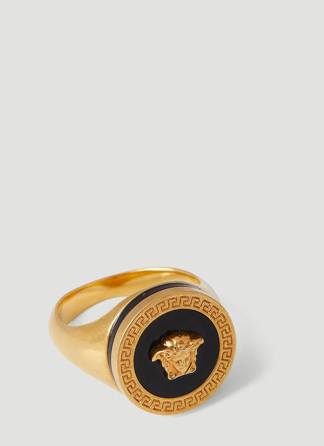 Enamel Medusa ring framed by Grega engravings. - Raised Medusa - Greca engravings - Hypo-allergenic - Made in Italy - 100% Metal - Color: Gold - Code: DG57285 DJMR 4J620