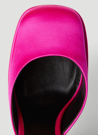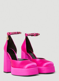 - Technical blend fabrication in a satin weave - Open toe - Embellished buckle-fastening ankle strap - Medusa-motif at strap - Block heel - Stacked platform sole - Made in Italy - 72% Viscose, 28% Silk - Color: Pink - Code: 1007718 DRA67 1PA4V