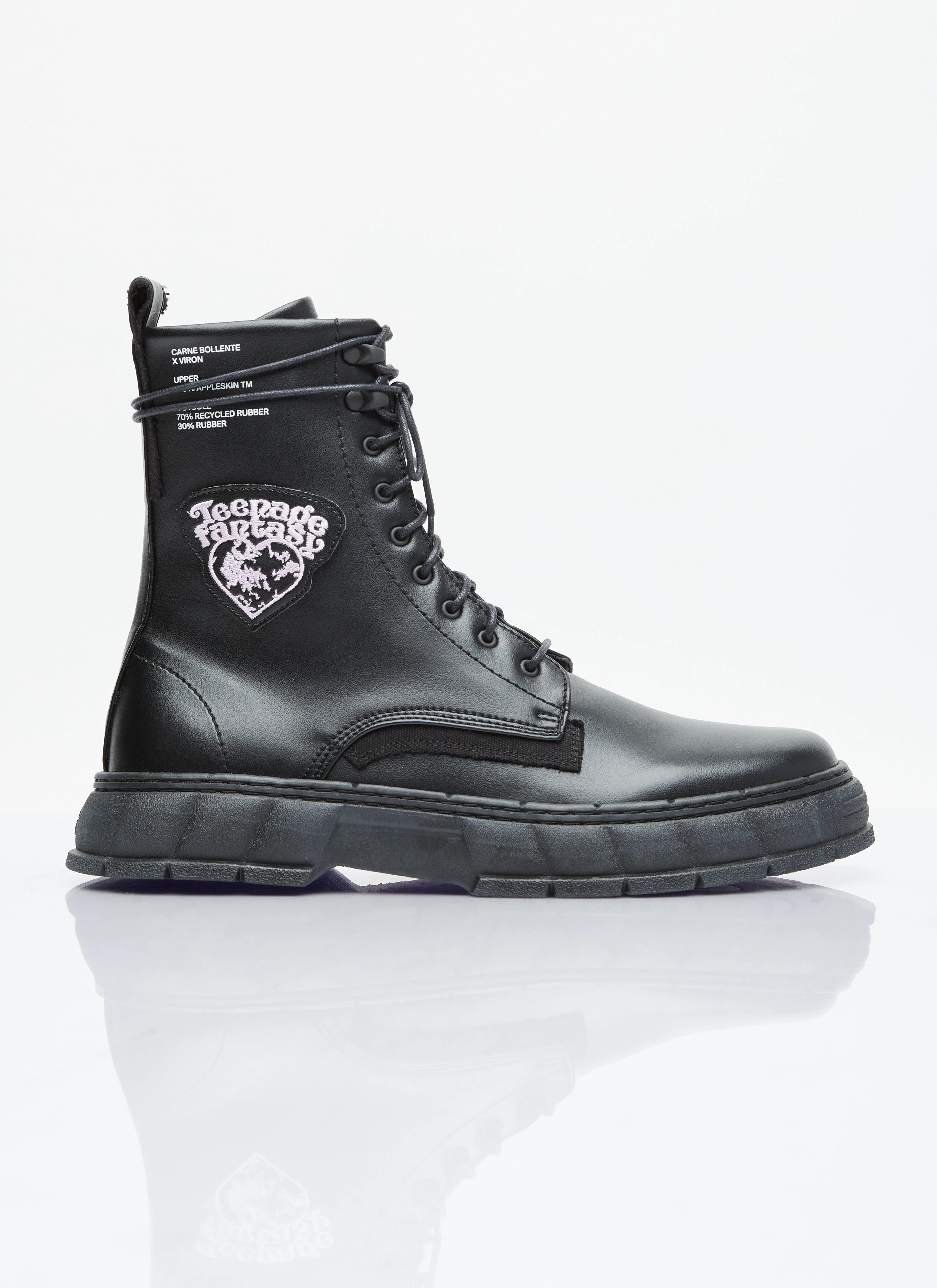 1992 Appleskin boots with embroidered patch at side. - Round toe - Lace-up fastening - Logo print at tongue - Composition print at side - Rear pull tab - Embroidered patch at side - Rear logo print - Panel construction - Chunky sole - 26% Apple waste, 20% Polyester, 38% Polyurethane, 16% Cotton - Color: Black - Code: 1992-07-A-940