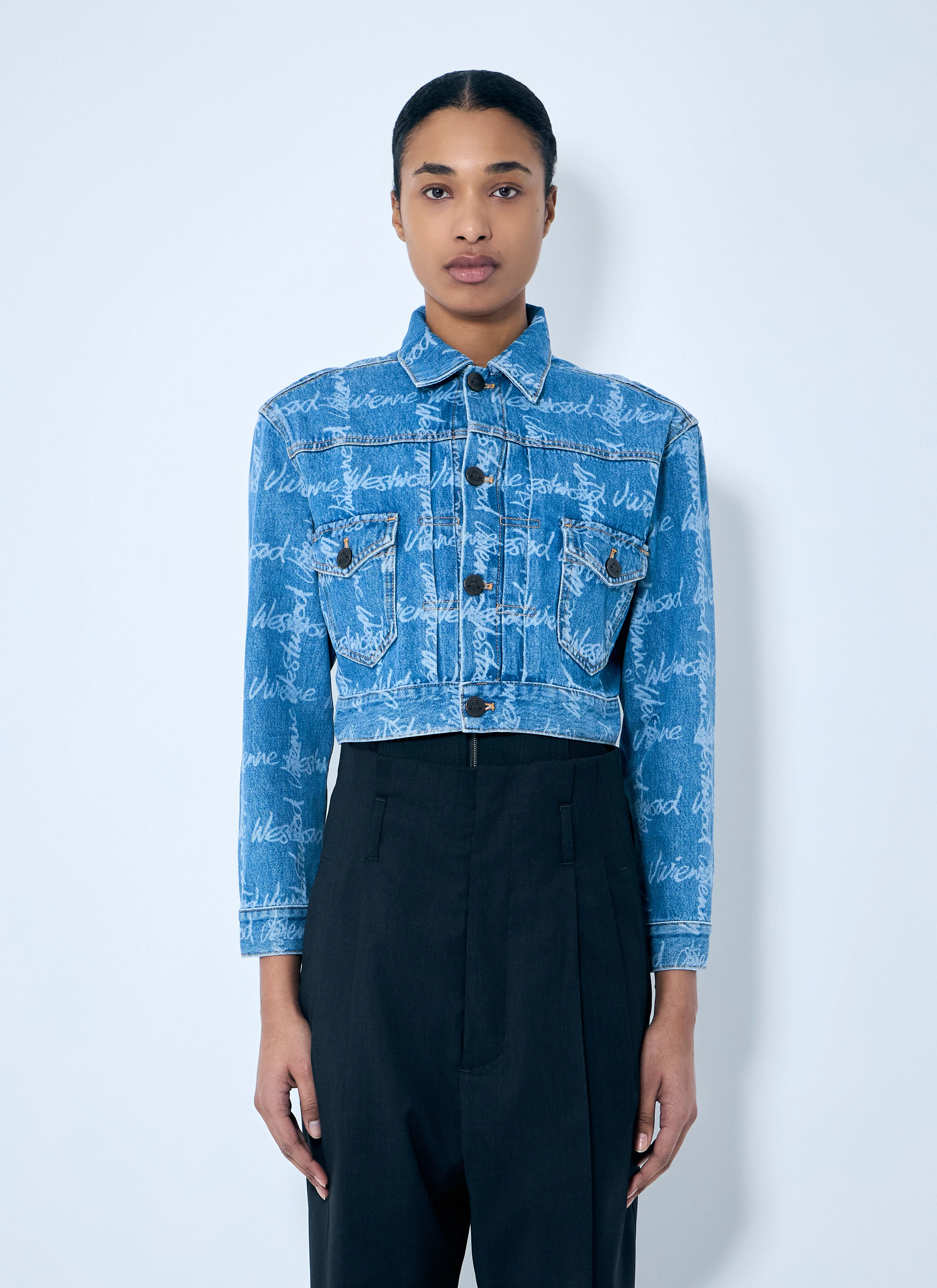 Denim jacket with all-over logo motif. - Classic collar - Front button fastening - Long sleeves - Front button-fastening pockets - Button-fastening cuffs - Adjustable tabs at hem - Cropped construction - 100% Cotton. Dry clean - Color: Blue - Code: 19010018-W014I-K306