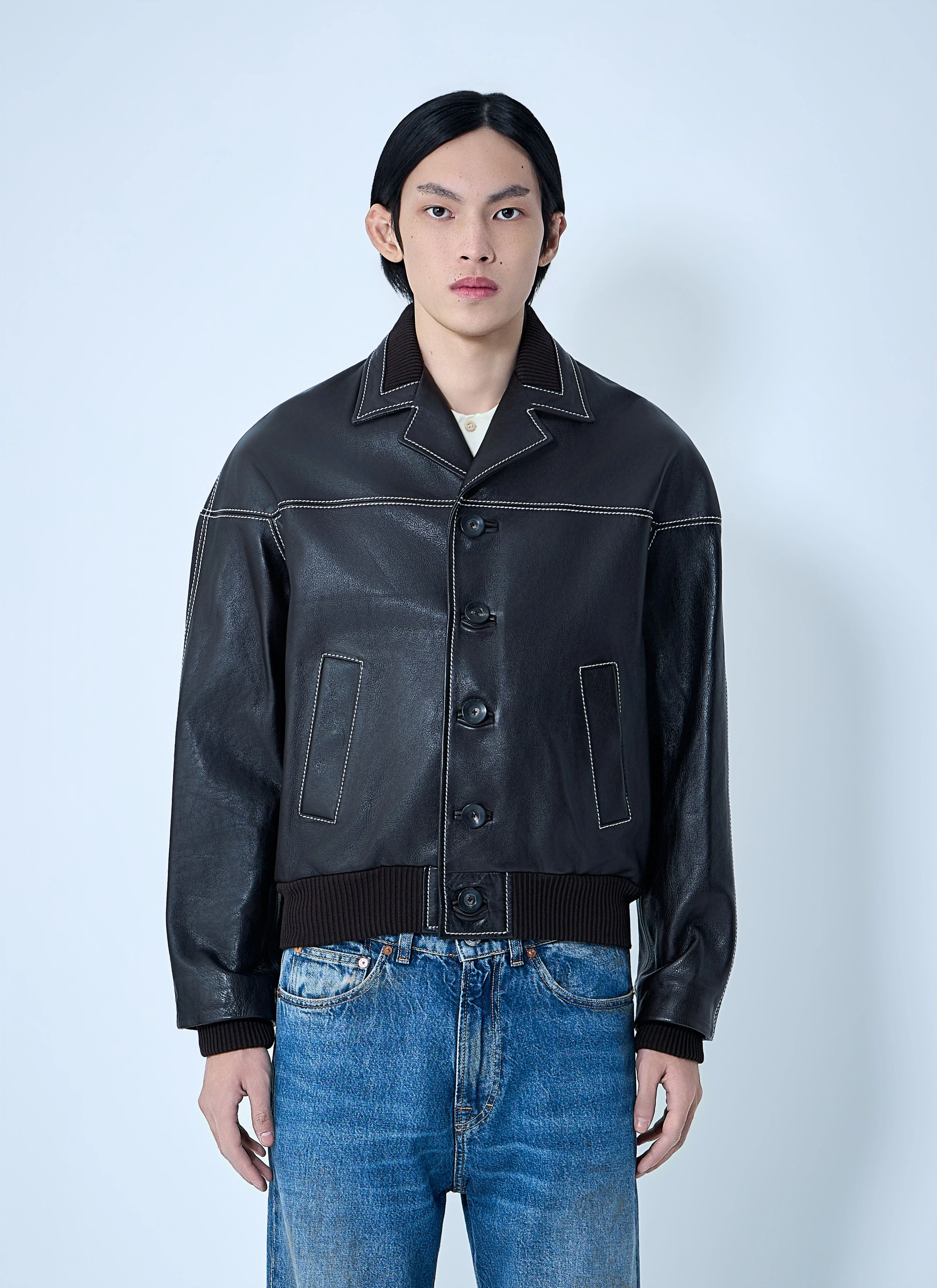 Button-up jacket in leather with ribbed trims. - Notched lapels - Front button fastening - Long sleeves - Side slip pockets - 100% Leather - Color: Dark Brown - Code: US26LE01-LE01-801 GRAINY CALF