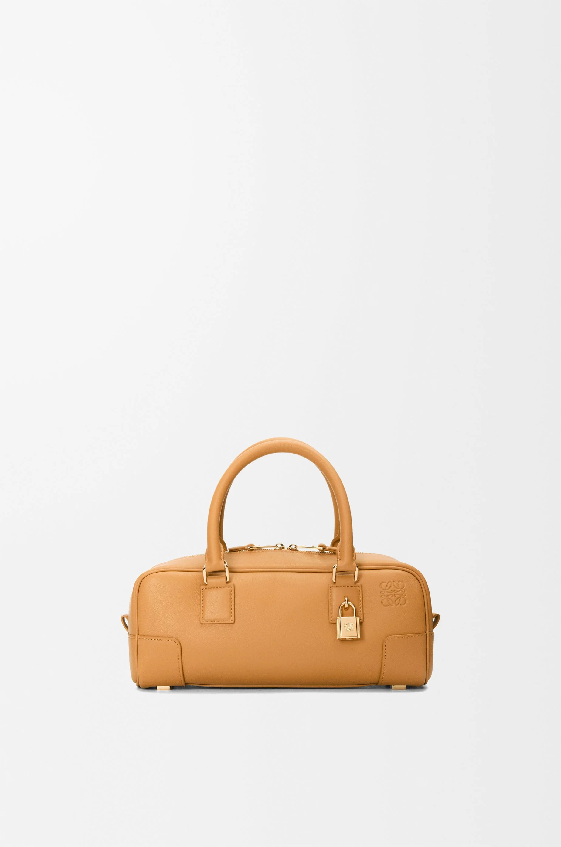 The Amazona displays a classic shape complemented by a signature padlock. This cropped version is crafted in nappa calfskin. - Shoulder, crossbody or hand carry - Detachable and adjustable strap - Zip closure with calfskin pulls - One internal zipped compartment, one slip pocket - Protective metal feet on base - Gold suede lining - Embossed Anagram Colour: Warm Desert Metallic colour: Gold Main material: Nappa calf Strap length: 85 - 112 cm Strap drop: 40 - 54 cm Handle drop: 10 cm Weight: 0.5 kg Height: 11 cm Width: 23 cm Depth: 10 cm Made in: Spain