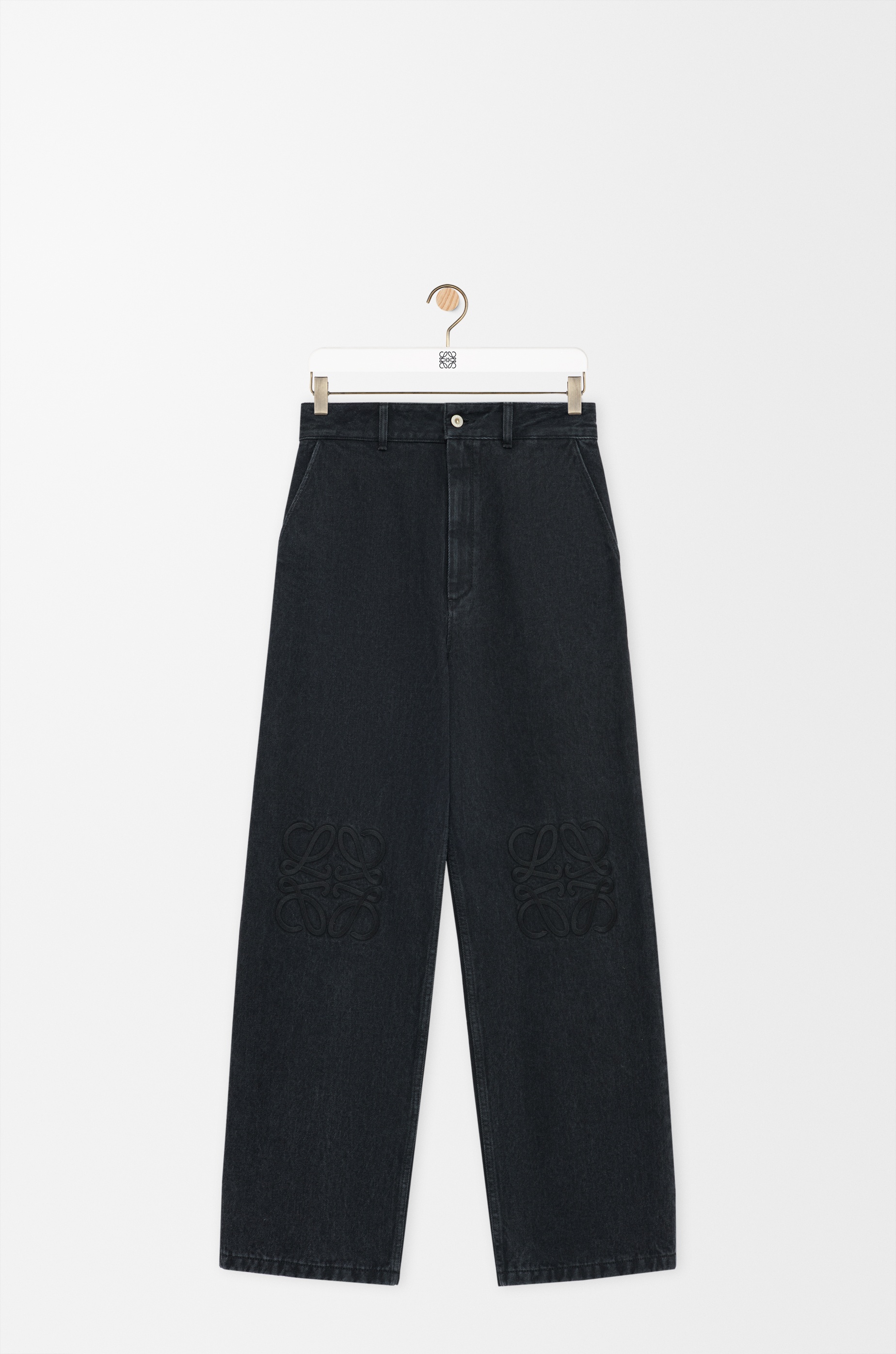 Jeans in medium-weight washed cotton denim featuring Anagram embroideries at the knees. - Relaxed fit, regular length - Mid waist, loose leg - Five pocket style - Concealed button fly - LOEWE embossed leather patch placed at the back Colour: Black Main material: Cotton Weight: 0.9 kg Made in: Italy Materials & care Main Material: 100% cotton