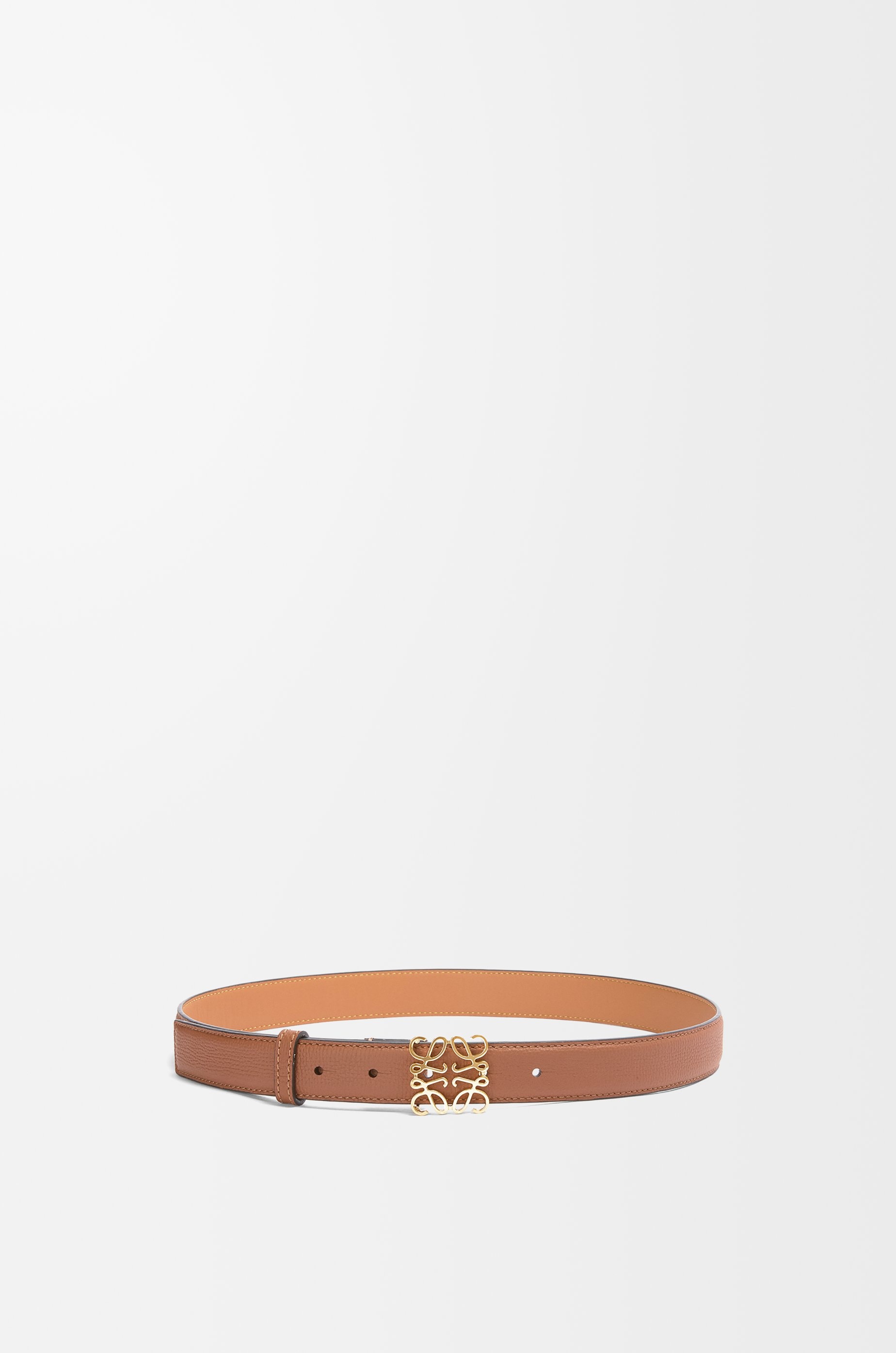 Belt in pebble grain calfskin with a LOEWE Anagram buckle. - 2.8cm wide - Five holes regulation Details - Colour: Tan/Gold - Metallic colour: Gold - Main material: Pebble Grain Calf/Brass - Weight: 0.09 kg - Height (cm): 2.8 - Width (cm): 64 - Depth (cm): 0.3 - Height (inch): 1.1 - Width (inch): 25.2 - Depth (inch): 0.1 - Model ID: E619Z26X04 - Made in: Portugal