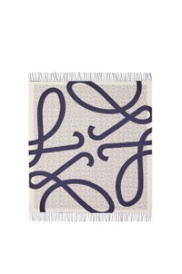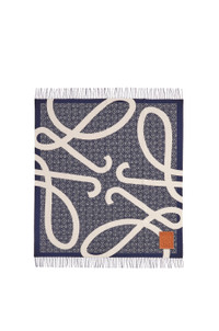 Anagram blanket crafted in medium-weight double face jacquard wool canvas. - 130cm x 140cm - Anagram all over and contrast Anagram jacquard - Fringed edges - LOEWE Anagram embossed leather patch placed on the corner Details - Colour: Navy Blue - Main material: Wool/Calf - Weight: 0.635 kg - Height (cm): 140 - Width (cm): 130 - Height (inch): 55.1 - Width (inch): 51.2 - Model ID: K000230X33 - CIL: 0010689362 - Made in: Italy