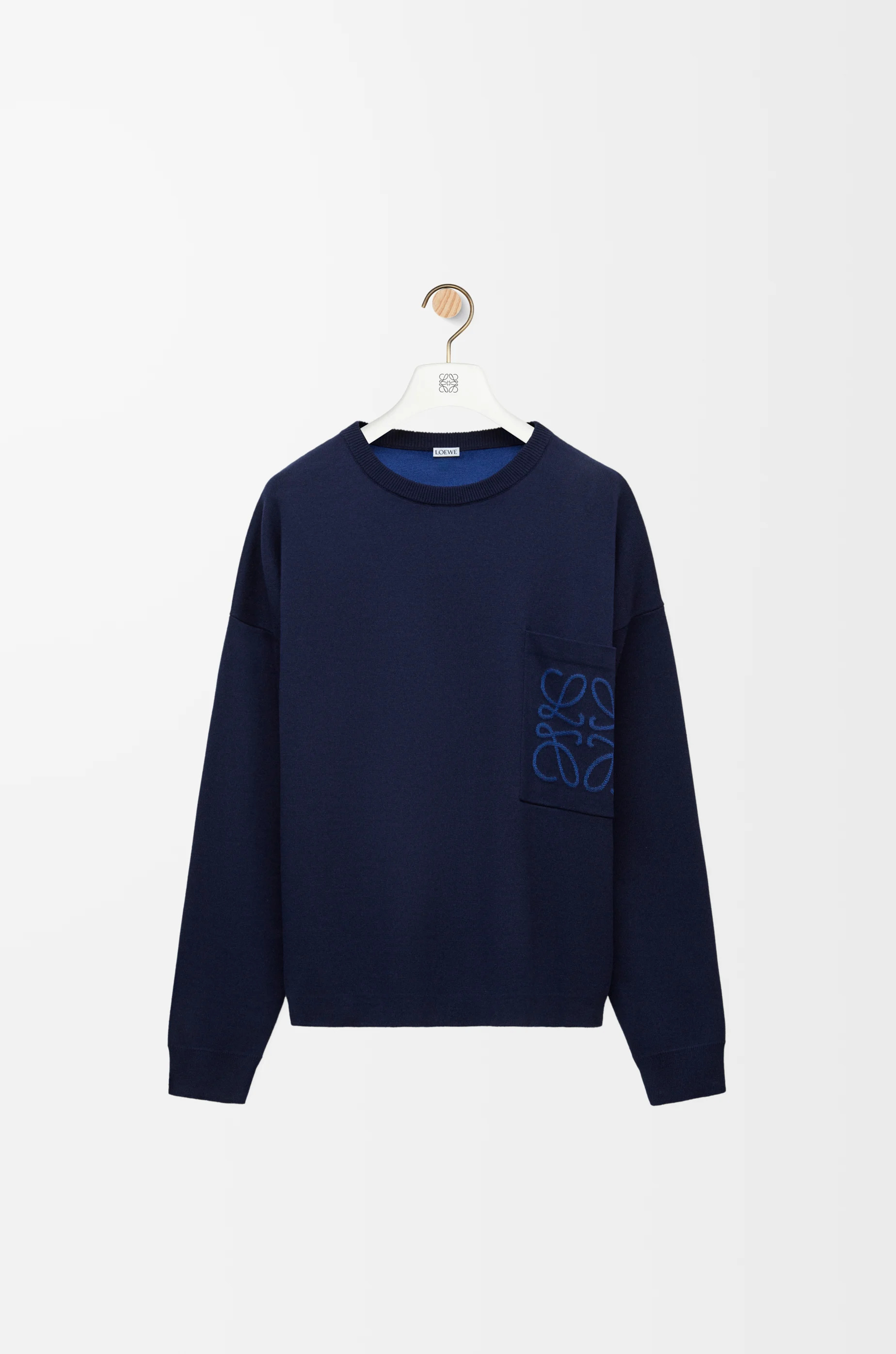 Sweater in medium-weight cotton blend double face featuring an Anagram intarsia placed on chest patch pocket. - Relaxed fit, regular length - Dropped shoulder - Round neck - Ribbed collar and cuffs - Self-start hem Details - Colour : Navy Blue - Main material : Cotton/Viscose - Weight : 1.0 kg - Model ID : H526Y14KKI - Made in : Italy