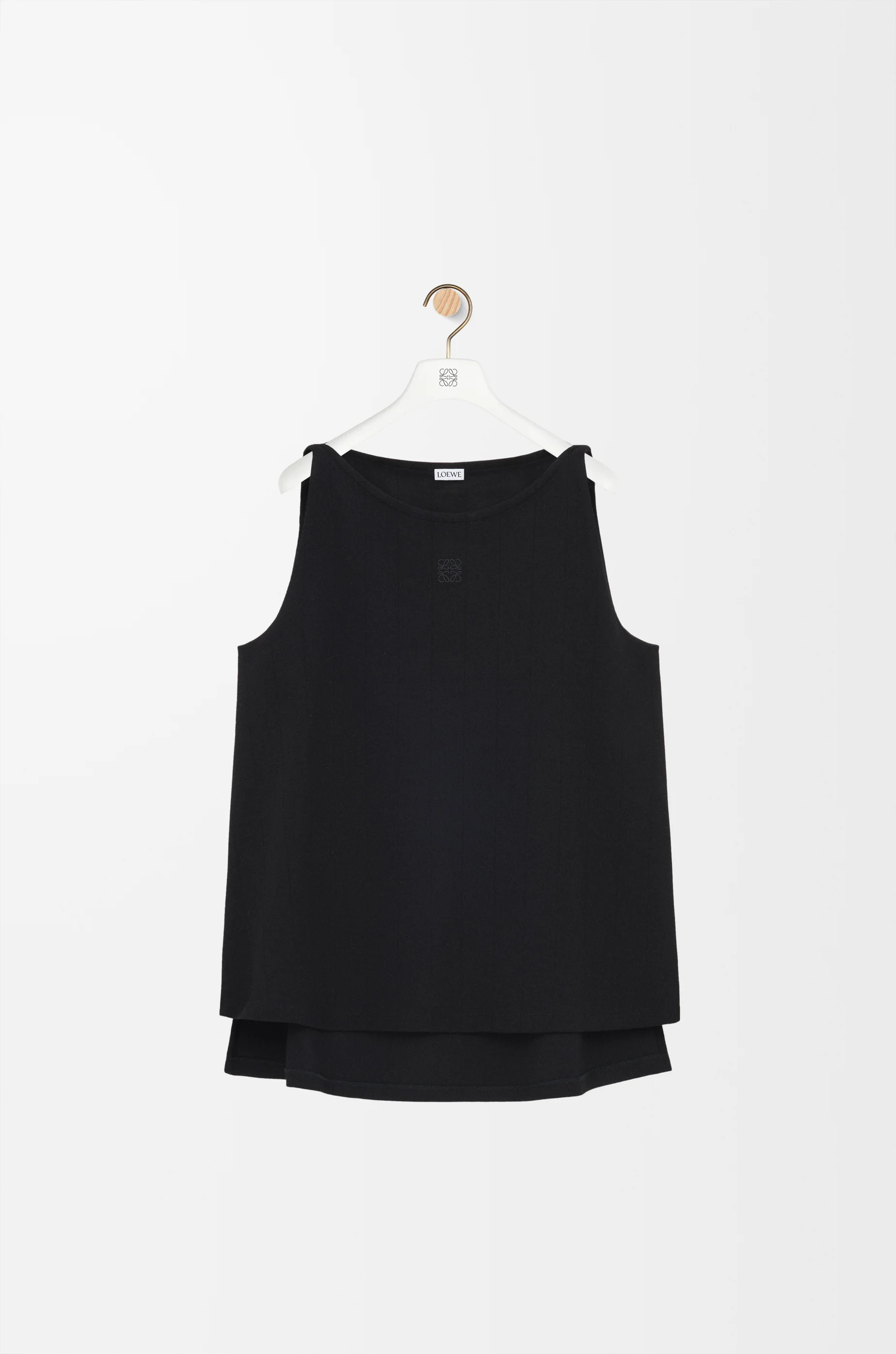 Top in lightweight stretch viscose blend featuring a trapeze silhouette. - Relaxed fit, regular length - Boat neck - Asymmetric front to back hem - Anagram embroidery placed at the front Colour: Black Main material: Viscose / polyamide / elastane Weight: 0.27 kg Made in: Portugal Materials & care Main Material: 69% viscose 27% polyamide 4% elastane