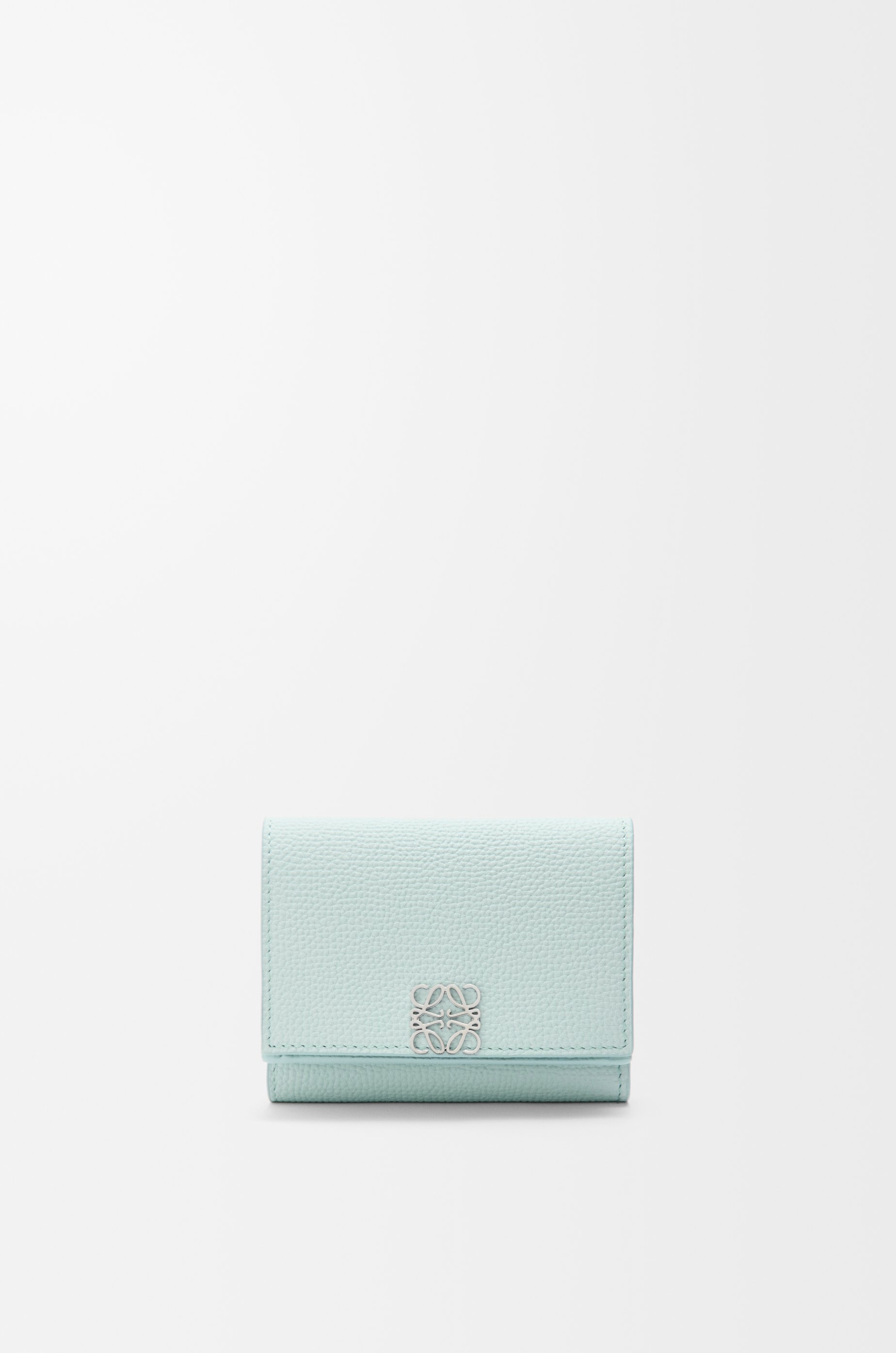 Trifold wallet in pebble grained calfskin. - Six card slots, one large pocket, one coin compartment - Snap button closure - Calfskin lining - Silver-finish metal Anagram Colour: Frozen Metallic colour: Palladium Main material: Pebble Grain Calf Weight: 0.1 kg Height: 7.8 cm Width: 10.2 cm Depth: 3.8 cm Made in: Spain
