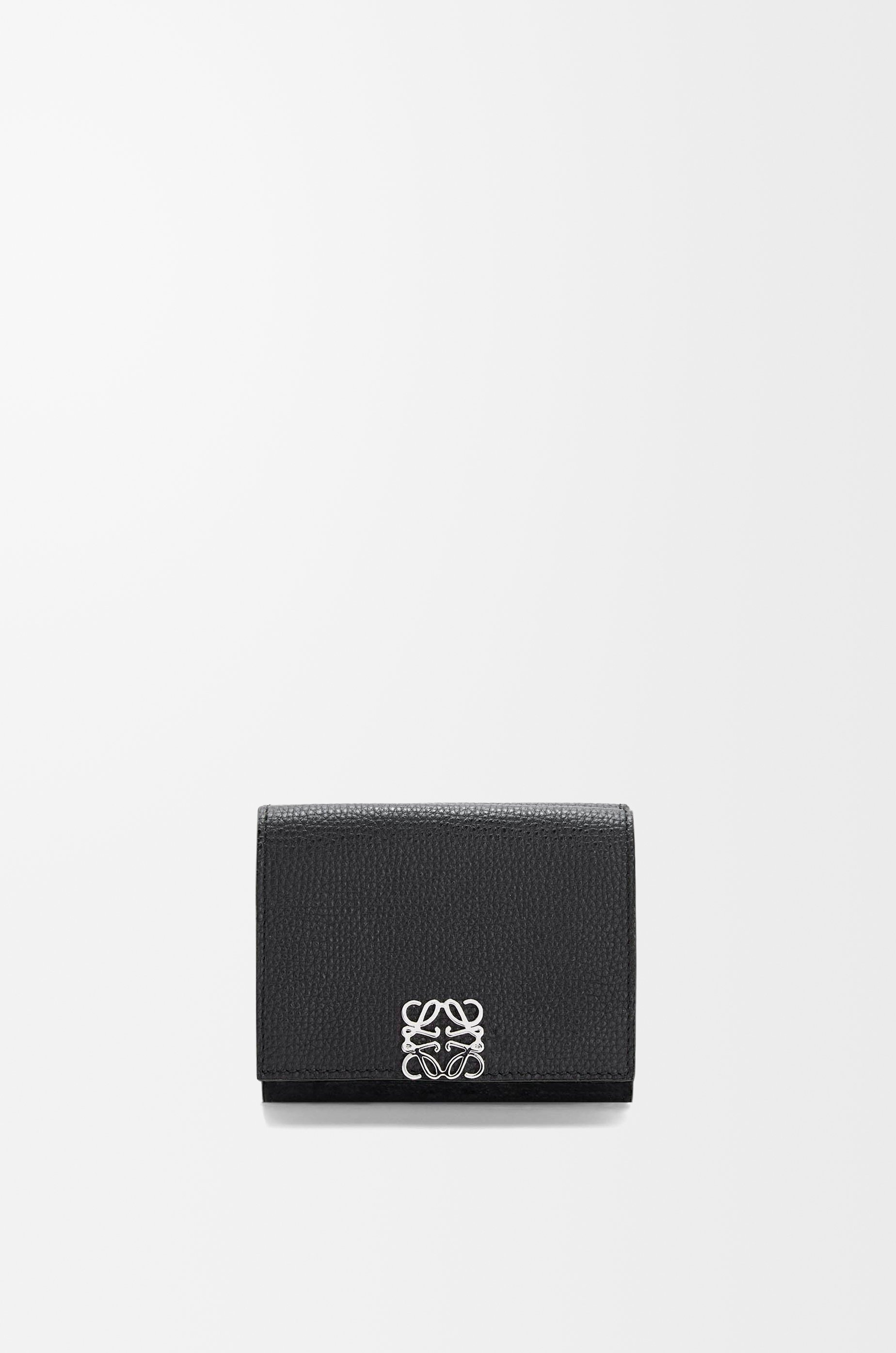Trifold wallet in pebble grained calfskin. - Six card slots, one large pocket, one coin compartment - Snap button closure - Calfskin lining - Silver-finish metal Anagram Details - Colour : Black - Metallic colour : Palladium - Main material : Pebble Grain Calf - Weight : 0.1 kg - Height (cm) : 7.8 - Width (cm) : 10.2 - Depth (cm) : 3.8 - Height (inch) : 3.1 - Width (inch) : 4 - Depth (inch) : 1.5 - Model ID : C821TR2X16 - CIL : - 0011191210 - Made in : Spain