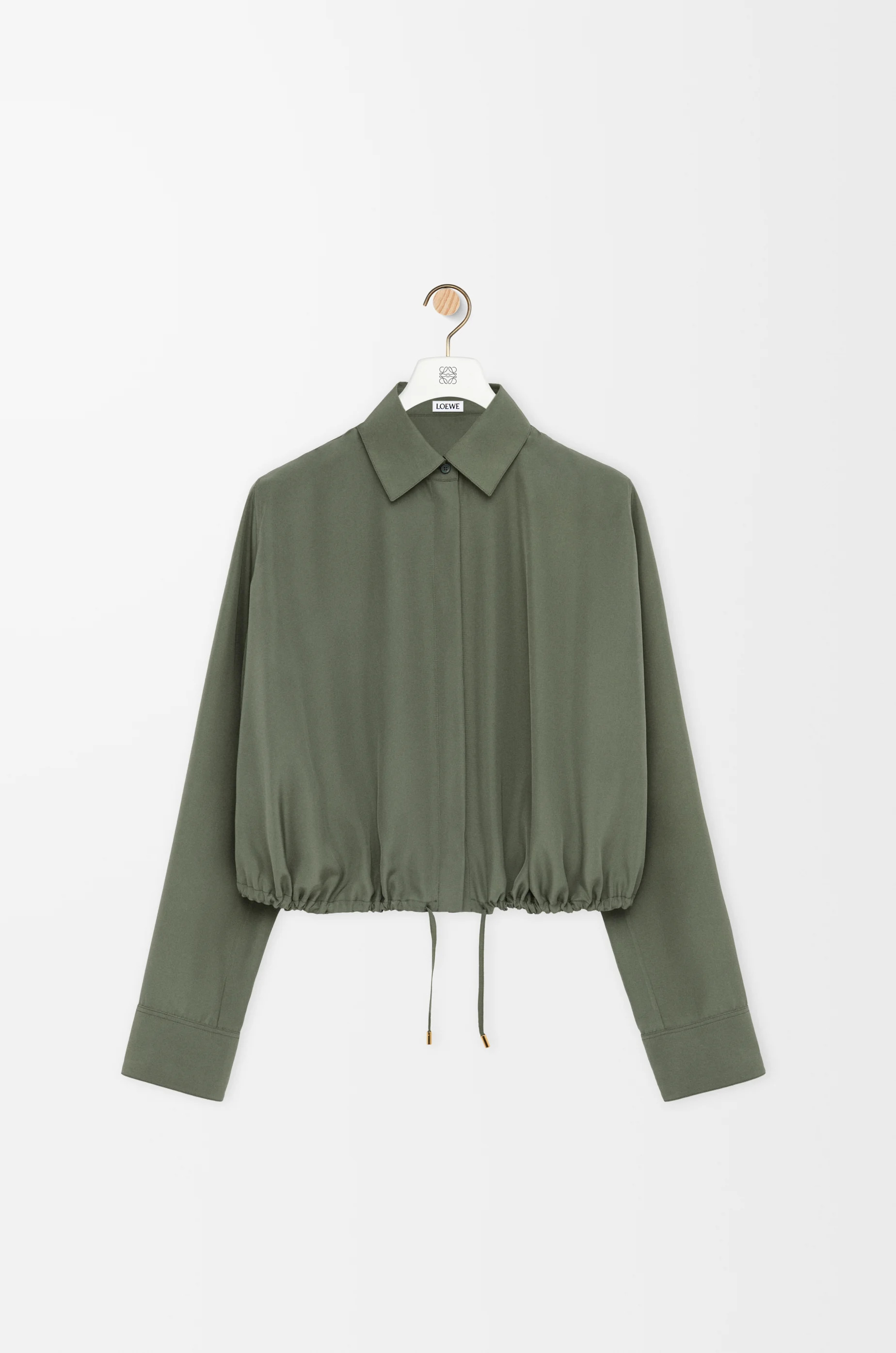 Shirt in lightweight matte silk crepe featuring a balloon silhouette with a front adjustable drawstring hem. - Relaxed fit, regular length - Classic collar - Concealed button front fastening, buttoned cuffs - Anagram embroidery placed at the cuff Colour: Khaki Green Main material: Silk Weight: 0.2 kg Made in: Italy Materials & care Main Material: 100% silk