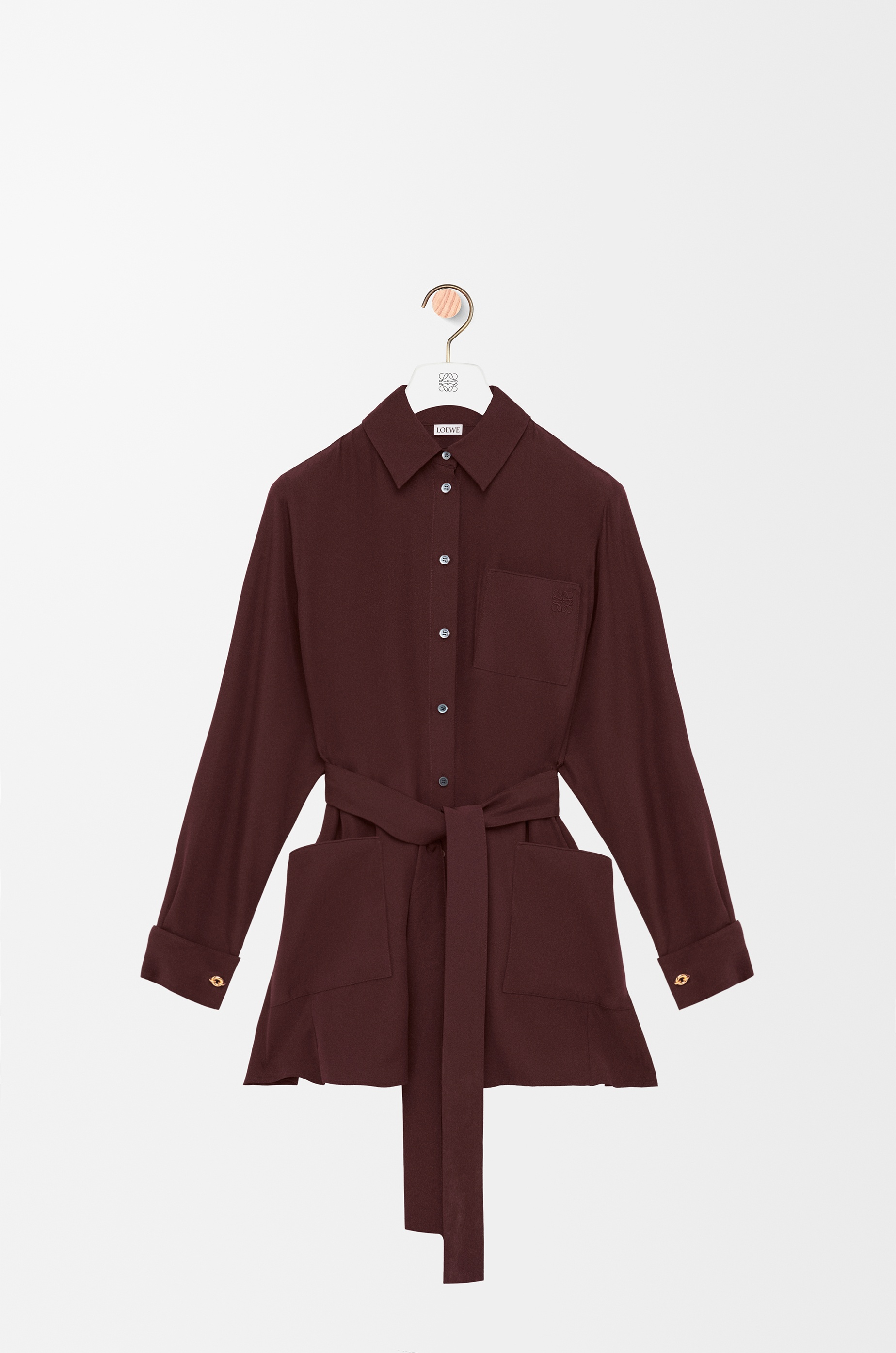 Blouse in lightweight matte silk crepe featuring a self-tie belt at the waist and donut chain cuff links. - Relaxed fit, long length - Classic collar - Button front fastening - Chest patch pocket - Anagram embroidery placed on the belt Colour: Burgundy Main material: Silk Weight: 0.25 kg Made in: Italy Materials & care Main Material: 100% silk