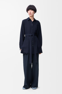 Blouse in lightweight matte silk crepe featuring a self-tie belt at the waist and donut chain cuff links. - Relaxed fit, long length - Classic collar - Button front fastening - Chest patch pocket - Anagram embroidery placed on the belt Colour: Navy Blue Main material: Silk Weight: 0.25 kg Made in: Italy Materials & care Main Material: 100% silk