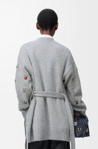 Cardigan in medium-weight brushed wool featuring allover placed Futurist cat embroideries on the front and sleeves, and a self-tie belt at the waist. This cardigan is inspired by Louis Wain's "Futurist Cats" porcelain vase series. - Relaxed fit, long length - Button front fastening - Ribbed cuffs and hem - Patch pockets - Anagram embroidery placed on the pocket Colour: Grey/Multicolor Main material: Wool Weight: 0.16 kg Made in: Italy Materials & care Main Material: 99% wool 1% polyamide
