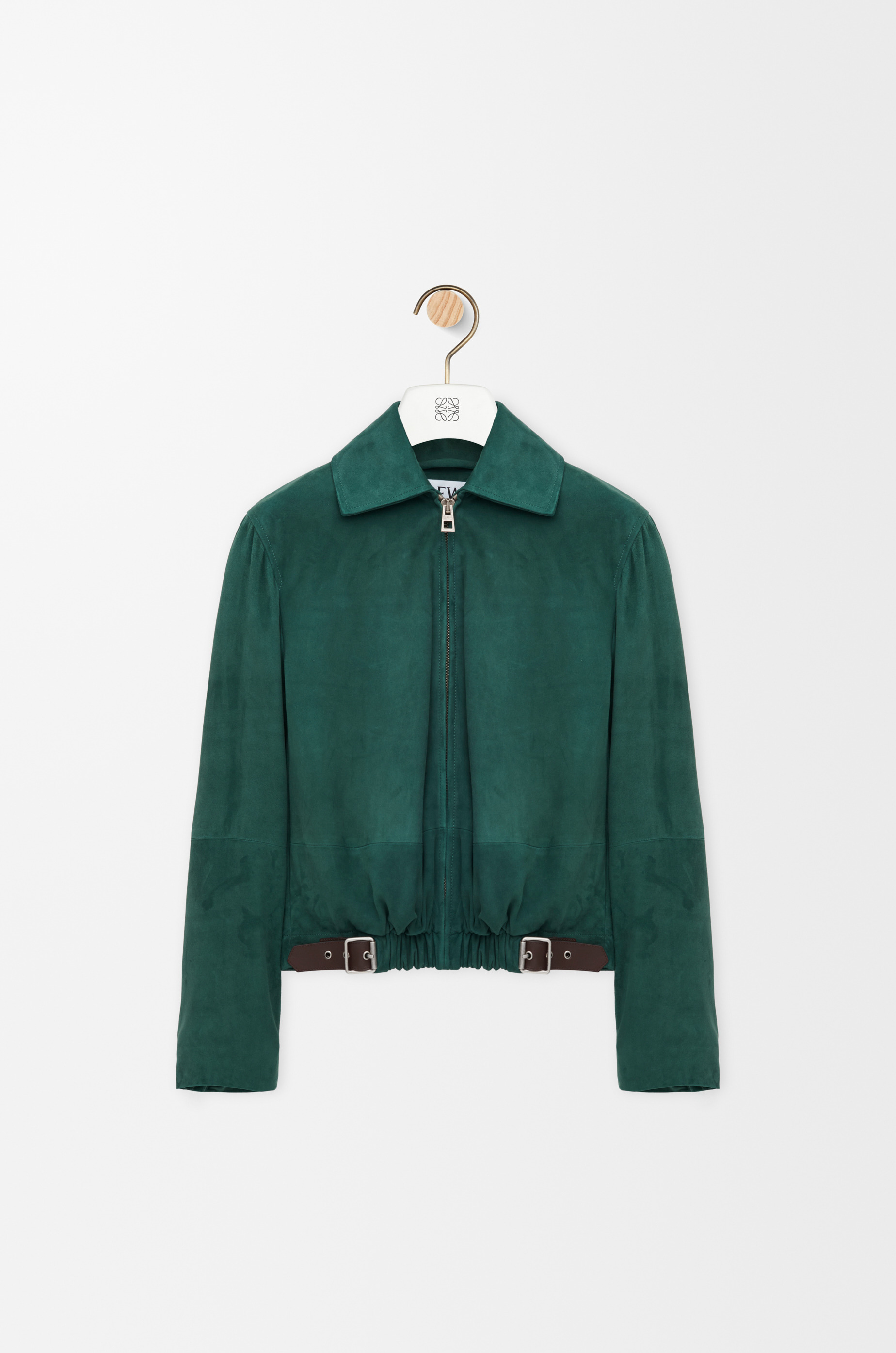 Jacket in lightweight suede goatskin featuring a gathered front with a contrast leather belt detail. - Regular fit, regular length - Classic collar - Zip front fastening, zipped cuffs - Seam pockets, inside welt pocket - Fully lined - LOEWE embossed leather patch placed at the back Colour: Green Main material: Suede Weight: 1.0 kg Made in: Spain Materials & care Main Material: 100% goat skin