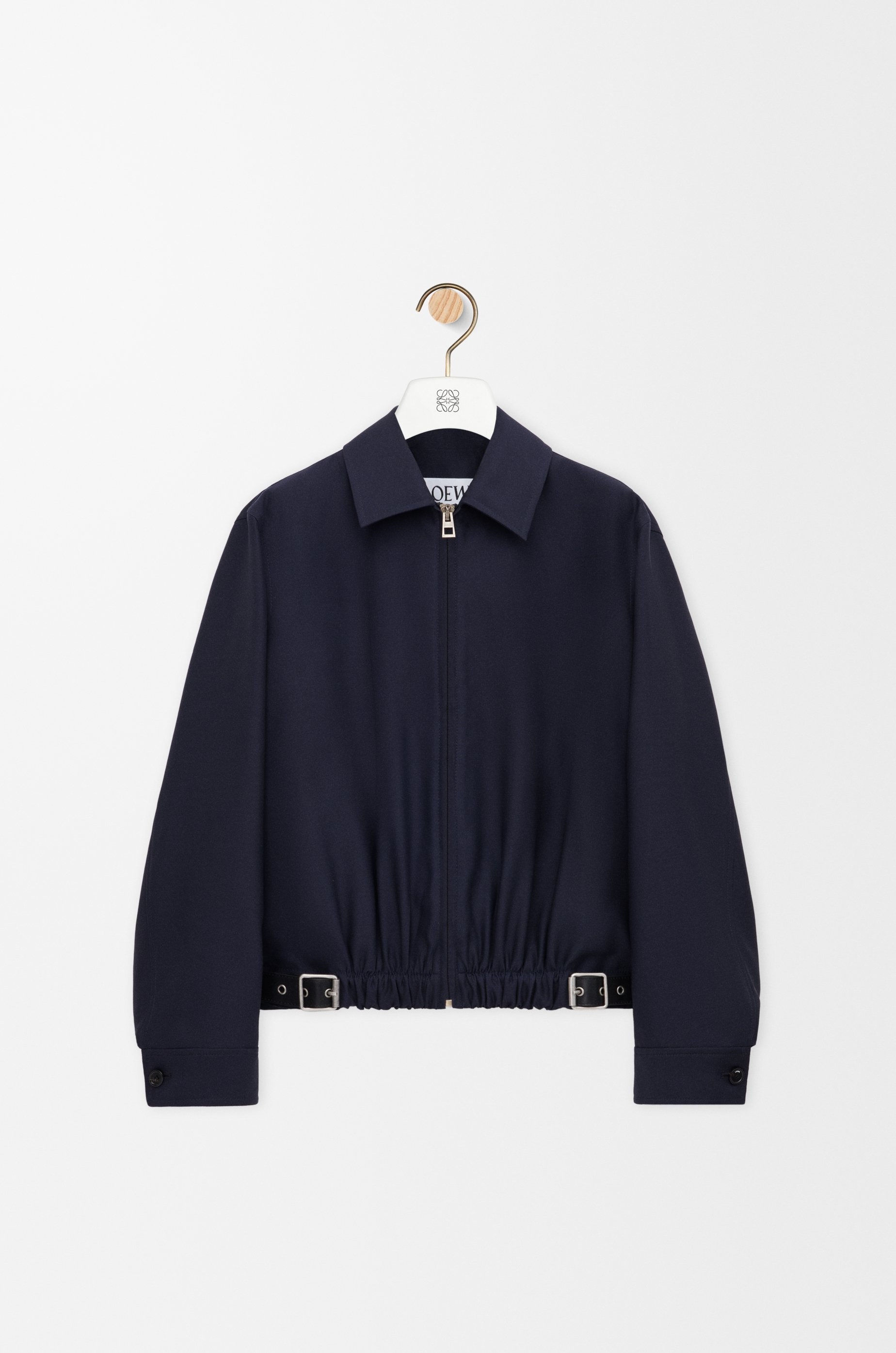 Jacket in medium-weight wool and silk tailoring featuring a gathered front with a leather belt detail. - Regular fit, regular length - Classic collar - Zip front fastening, buttoned cuffs - Seam pockets, inside jet pocket - Fully lined - LOEWE embossed leather patch placed at the back Colour: Navy Blue Main material: Wool/Silk Weight: 0.7 kg Made in: Italy Materials & care Main Material: 71% wool 29% silk