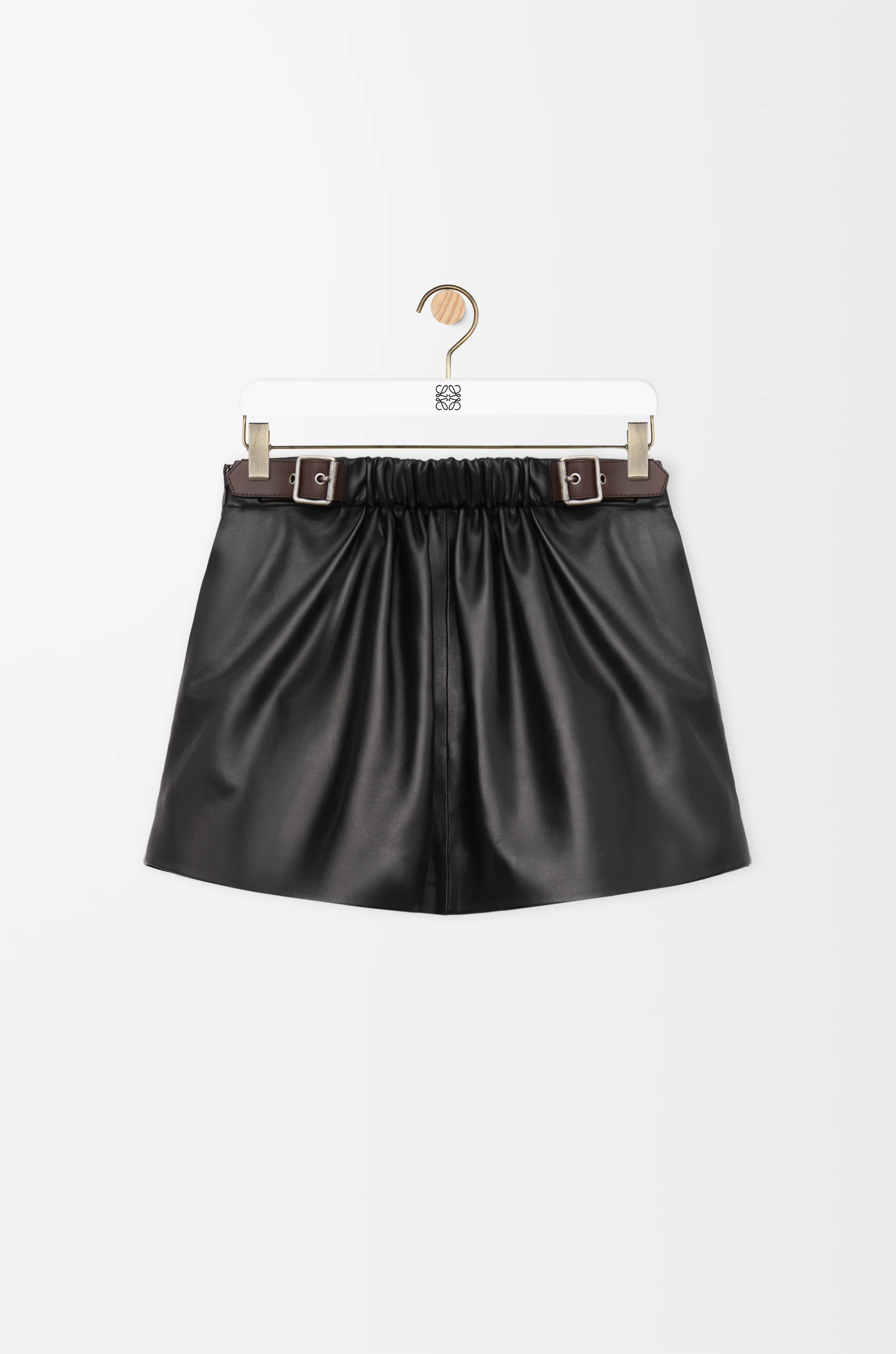 Skirt in lightweight nappa plonge lambskin featuring a gathered front with a contrast leather belt detail. - Regular fit, short length - Mid waist - Side zip fastening - Seam pockets, buttoned rear jet pocket - Fully lined - LOEWE embossed leather patch placed at the back Colour: Black Main material: Nappa Weight: 0.4 kg Made in: Italy Materials & care Main Material: 100% lambskin