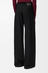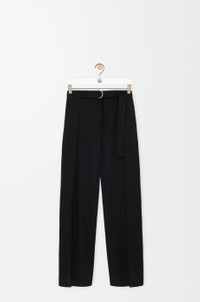 Trousers in lightweight fluid wool tailoring featuring an adjustable fabric belt and pleats at the front. - Regular fit, regular length - Mid waist, straight leg - Concealed zip fly - Slash pockets and buttoned rear welt pocket - LOEWE engraved D-ring, LOEWE embossed leather patch placed at the back Colour: Black Main material: Wool Weight: 0.94 kg Made in: Italy Materials & care Main Material: 100% wool