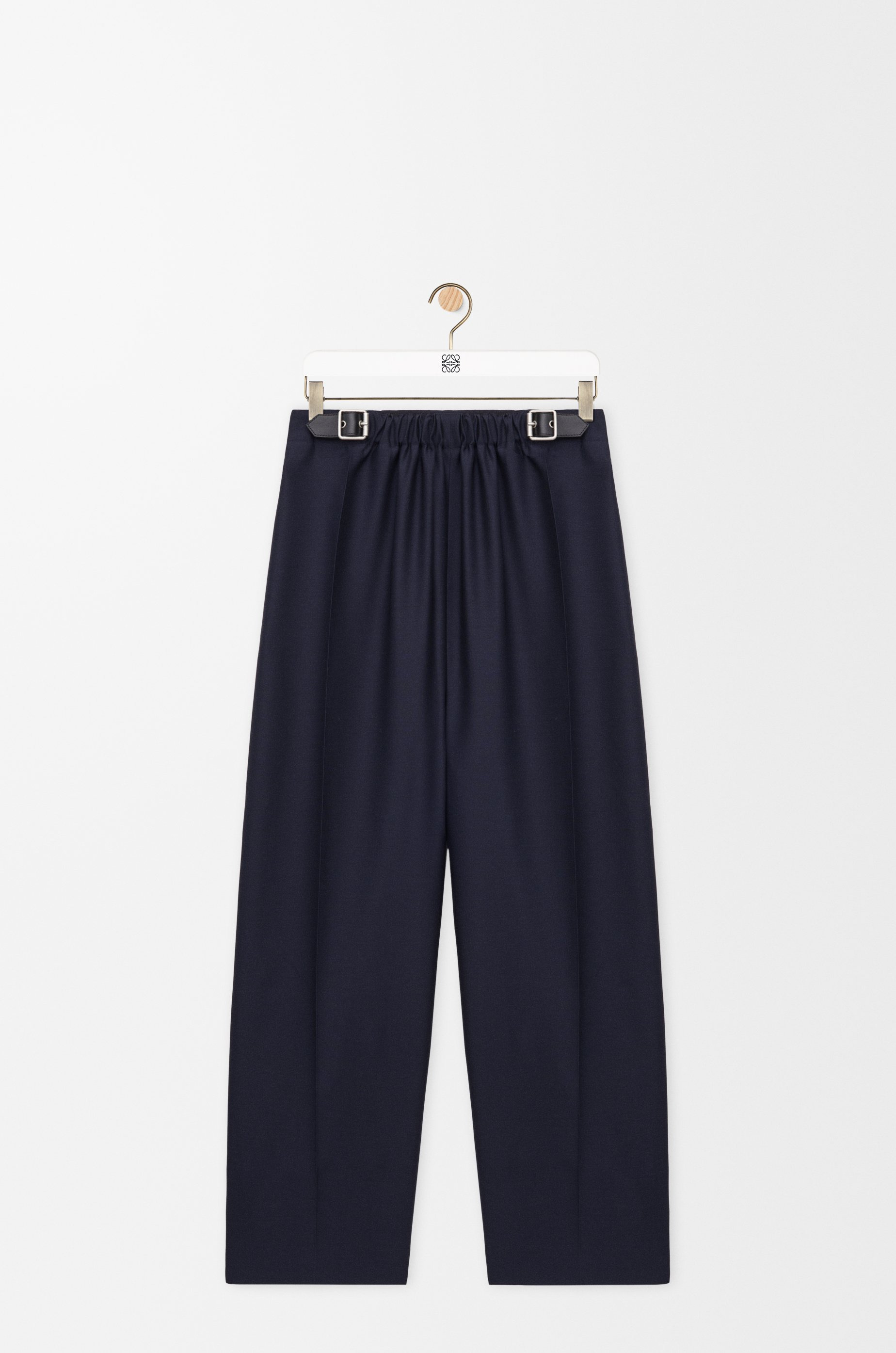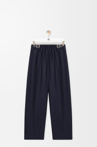 Trousers in medium-weight wool and silk tailoring featuring a gathered front with a leather belt detail. - Regular fit, regular length - Mid waist, straight leg - Side zip fastening - Seam pockets, buttoned rear jet pocket - Pressed creases at the front - LOEWE embossed leather patch placed at the back Colour: Navy Blue Main material: Wool/Silk Weight: 0.5 kg Made in: Italy Materials & care Main Material: 71% wool 29% silk
