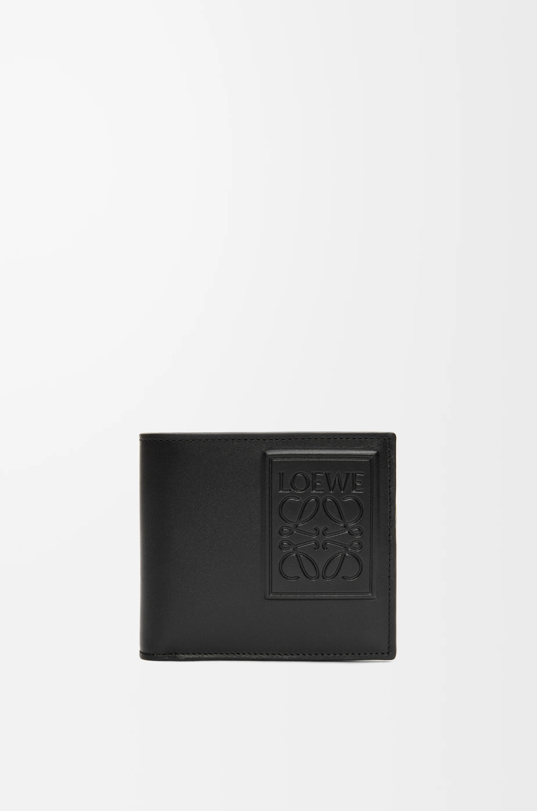 Bifold coin wallet in satin calfskin. - Four card slots, two large note pockets, one flat pocket - One coin compartment with snap button closure - Calfskin lining - Debossed LOEWE Anagram patch Colour: Black Metallic colour: Palladium Main material: Satin Calf Weight: 0.1 kg Height: 9.8 cm Width: 11 cm Depth: 2 cm Made in: Spain
