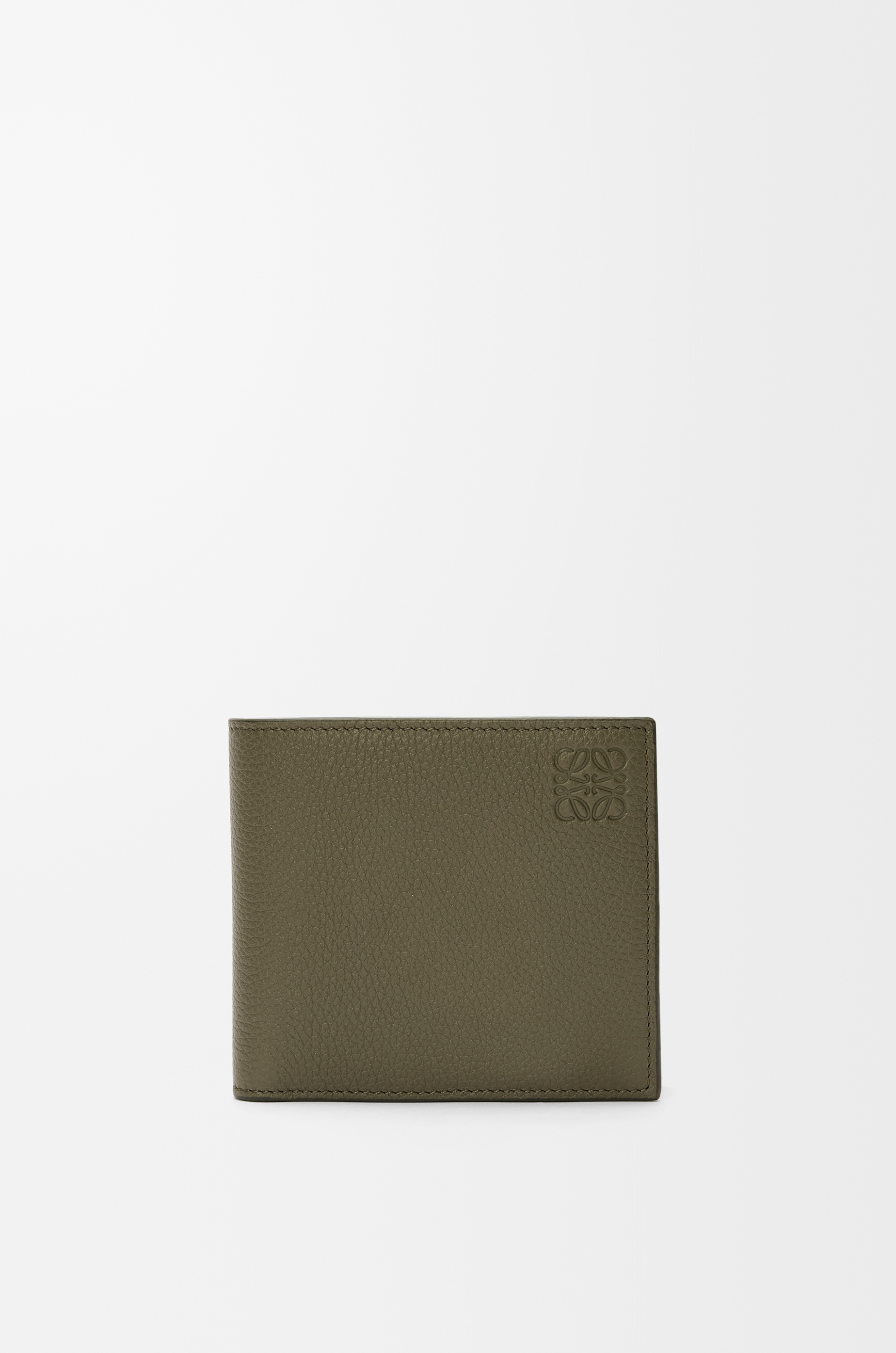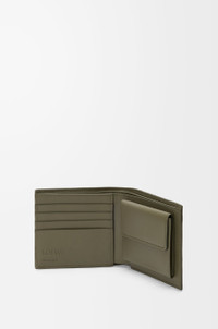 Bifold coin wallet in soft grained calfskin. - Four card slots, two large note pockets, one flat pocket - One coin compartment with a snap button closure - Calfskin lining - Embossed Anagram Colour: Khaki Green Metallic colour: Palladium Main material: Soft Grained Calf Weight: 0.1 kg Height: 9.8 cm Width: 11 cm Depth: 2 cm Made in: Spain