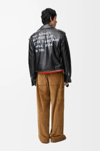 Jacket in super lightweight nappa lambskin featuring a biker silhouette and a Louis Wain digital paint-effect lettering print and embossed Futurist Cat at the back. This jacket is inspired by Louis Wain's "Futurist Cats" porcelain vase series. - Regular fit, regular length - Zip front fastening, zipped cuffs - Multiple zipped pockets - Adjustable belt at the hem - Fully lined - LOEWE Anagram embossed leather patch placed at the back Colour: Black Main material: Nappa Weight: 1.28 kg Made in: Italy Materials & care Main Material: 100% lambskin