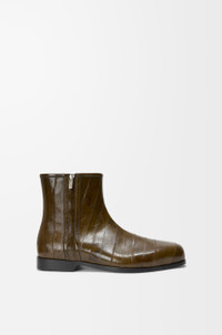 Ankle boot in hagfish with a distinctive toe shape and two side zips to allow for versatile styling. - 20mm heel - LOEWE engraved zip pullers - Leather outsole Colour: Olive Green Main material: Hagfish Weight: 1.2 kg Made in: Italy