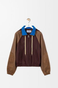 Jacket in lightweight nylon and nappa lambskin inspired by the Ballet runner, featuring a high collar with a drawstring and contrast rib knit on the inside, a packable hood, a LOEWE L on the chest and suede patches on the sleeves. - Regular fit, regular length - Zip front fastening - Elasticated cuffs - Welt pockets - Elasticated hem with drawstring - Fully lined - Embossed LOEWE placed at the back Colour: Brown Main material: Nappa/suede/polyamide Weight: 0.8 kg Made in: Italy Materials & care Main Material: 100% polyamide