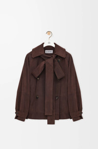 Jacket in lightweight suede goatskin featuring a double-breasted construction and a removable lavalliere bow. - Relaxed fit, regular length - Button front fastening - Buttoned tabs at the waist and cuffs - Fully lined Colour: Brown Main material: Suede Weight: 1.62 kg Made in: Spain Materials & care Main Material: 100% goat skin