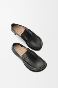 Loafer in soft calfskin featuring the LOEWE signature round toe shape, defined by a bulky asymmetrical look, and a collapsible heel. - 40mm kitten heel - Leather sole and extra padded leather insole Details - Colour : Black - Main material : Soft Calf - Heel height : 4 - Weight : 0.7 kg - Model ID : LLSCS07X06 - Made in : Italy