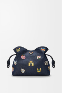 The Flamenco clutch is a soft and slouchy bag with a cinched closure and historical knot drawstrings. This medium version is crafted in denim embroidered with allover cat motifs. This bag is inspired by Louis Wain's "Futurist Cats" porcelain vase series. - Shoulder, crossbody or hand carry - Detachable and adjustable strap - Magnetic closure - Suede lining - Embroidered LOEWE Colour: Blue Metallic colour: Palladium Main material: Embroidered denim Strap length: 96-120 cm Strap drop: 38 - 44 cm Weight: 0.54 kg Height: 24.5 cm Width: 30 cm Depth: 10.5 cm Made in: Spain