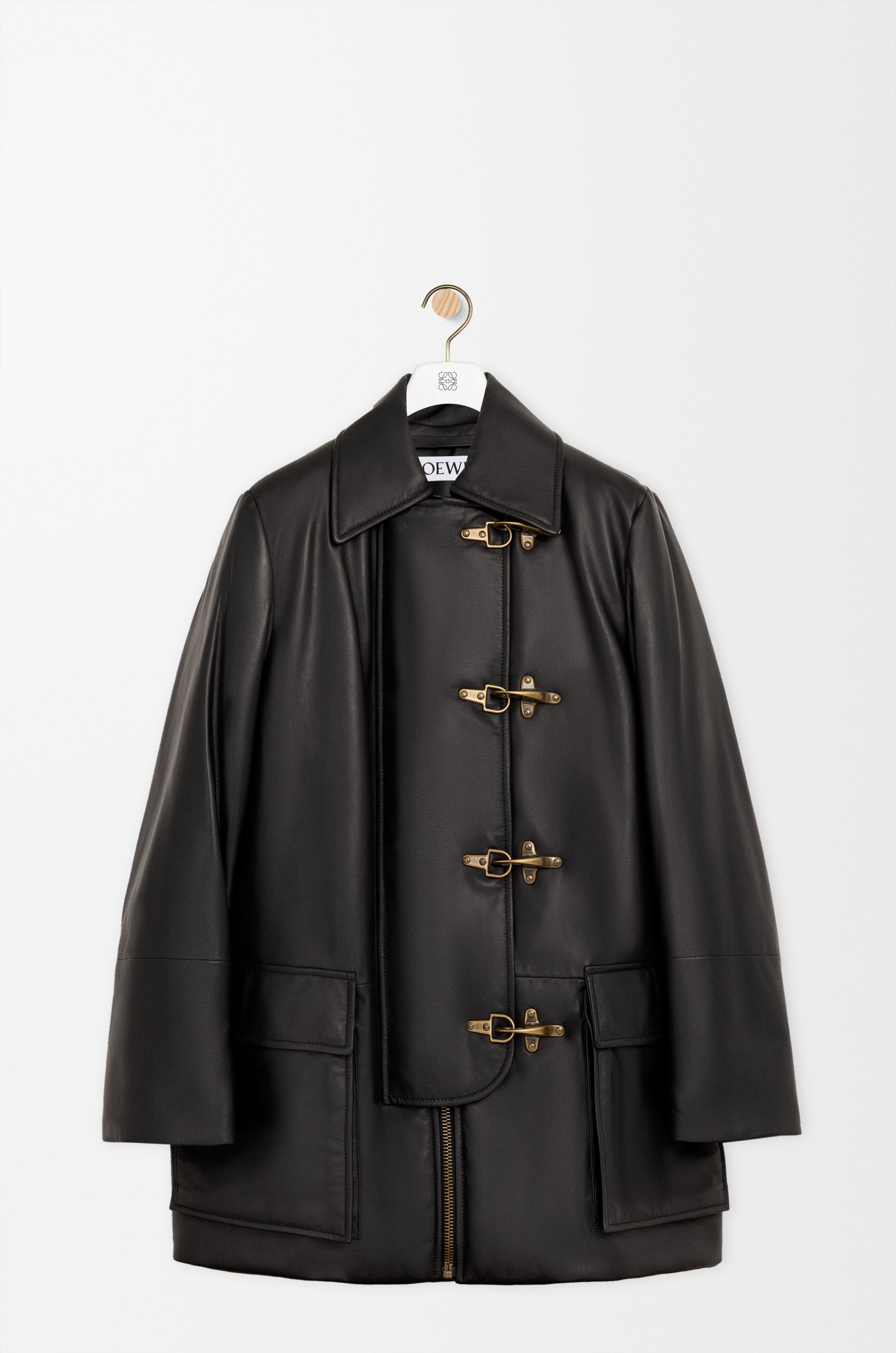 Coat in lightweight nappa lambskin featuring a wide placked with metal clasps and a light padded construction. - Regular fit, short length - Classic collar - Concealed zip front fastening - Gusset pockets - Fully lined - LOEWE Anagram embossed patch placed at the back Colour: Black Main material: Nappa Weight: 1.2 kg Made in: Italy Materials & care Main Material: 100% lambskin
