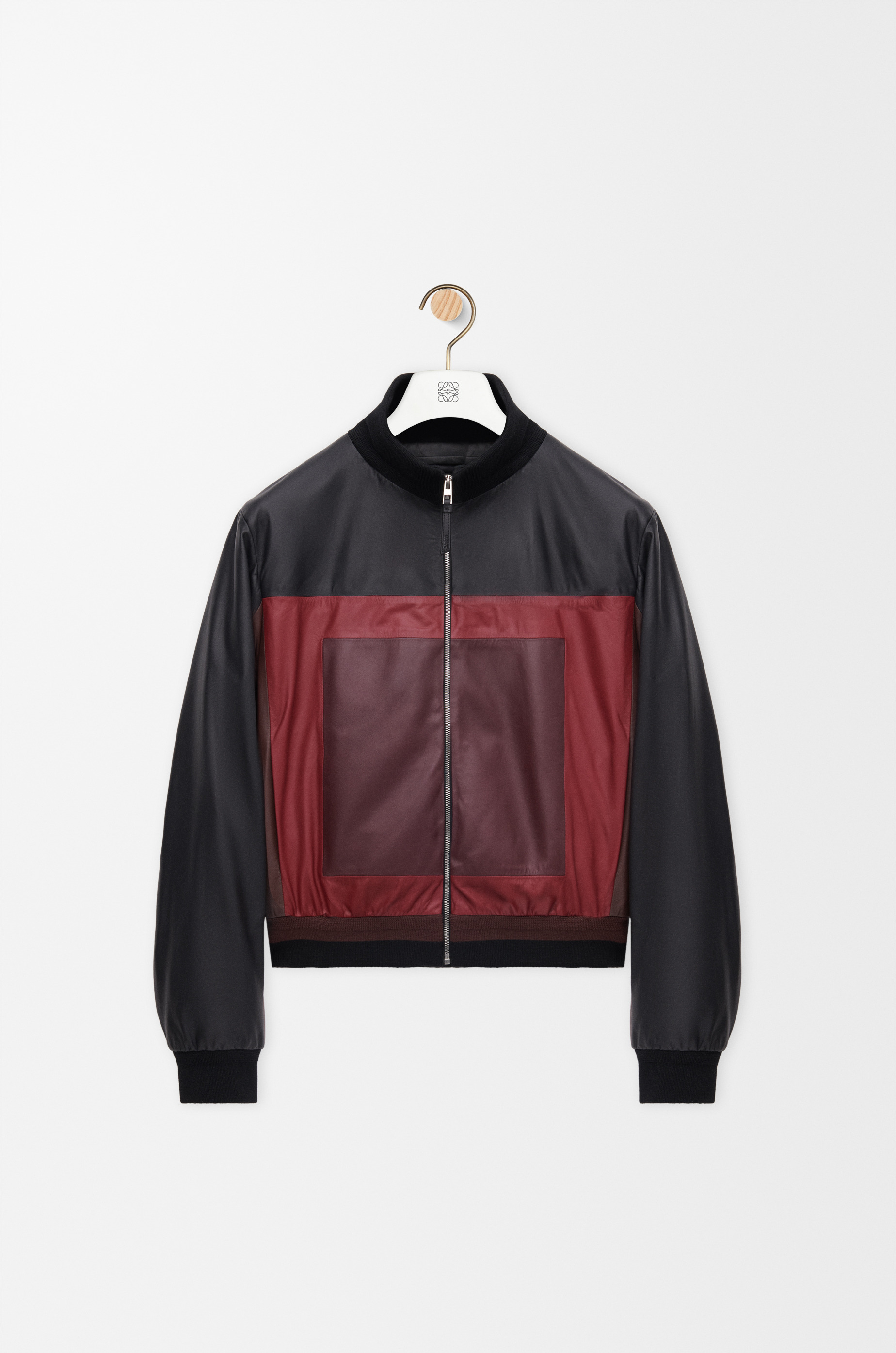 Jacket in lightweight nappa lambskin featuring placed intarsia squares inspired by Josef Albers's "Homage to the Square" series. This jacket is part of the LOEWE x Albers collection. - Small fit, short length - High neck - Rib knit collar, hem and cuffs - Zip front fastening with Puzzle puller - Seam pockets, inside welt pocket - Fully lined - Embossed Anagram placed at the back Colour: Black/Burgundy Main material: Nappa Weight: 0.4 kg Made in: Italy Materials & care Main Material: 100% lambskin
