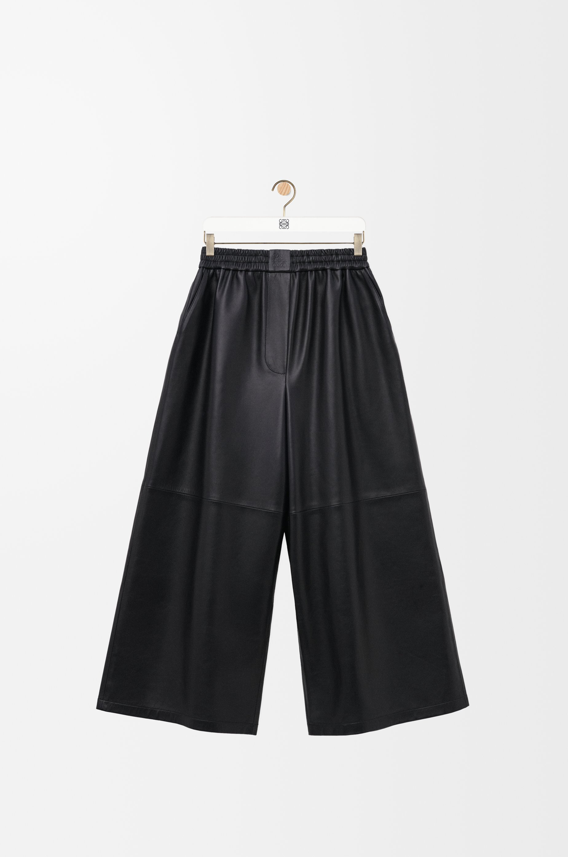 Trousers in lightweight satin nappa lambskin with an ultra-soft glove touch. - Relaxed fit, cropped length - Mid waist, loose leg - Elasticated waist - Slash pockets, rear patch pocket - Anagram embossed patch placed at the waist Details - Colour : Black - Main material : Nappa - Weight : 0.7 kg - Model ID : S359Y54L63 - Made in : Spain
