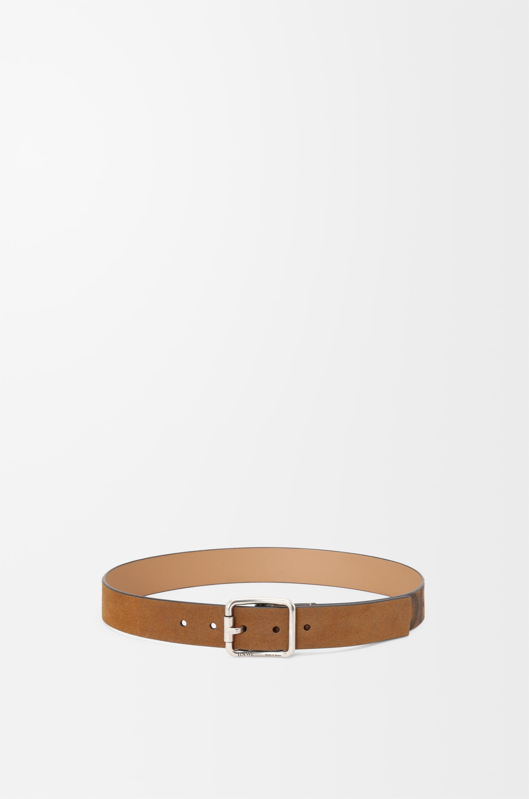 Belt in pressed suede featuring a lasered LOEWE signature. - Double Roller Curve prong buckle - 3.5cm wide - Five holes regulation - Engraved LOEWE Details - Colour : Cognac/Vintage Palladium - Metallic colour : Palladium - Main material : Pressed Suede - Weight : 0.14 kg - Depth (cm) : 3.5 - Depth (inch) : 1.4 - Model ID : E619Z20X80 - Made in : Spain