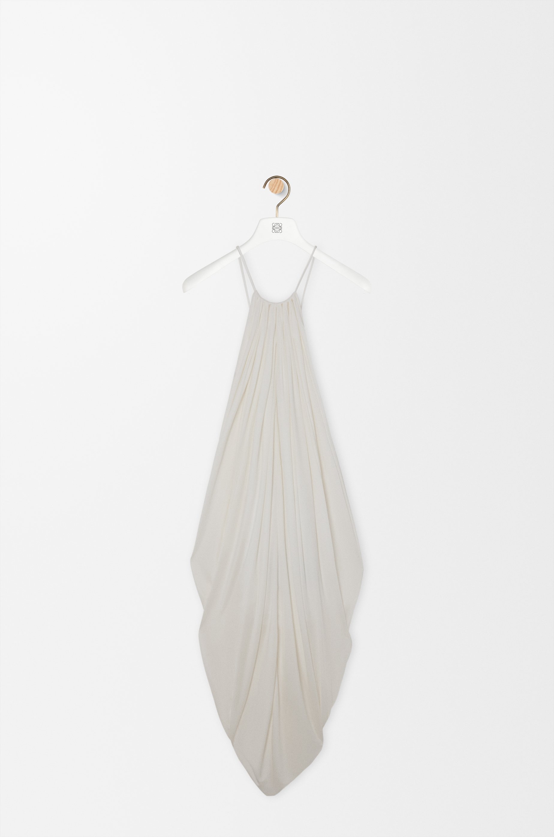 Dress in lightweight fluid silk jersey featuring an asymmetric draped silhouette and an open back with an oversized metal Anagram. - Regular fit, mid length - Halterneck - Thin straps Colour: White Main material: Silk Weight: 0.6 kg Made in: Italy Materials & care Main Material: 100% silk