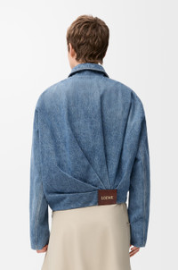 Jacket in medium-weight washed cotton denim featuring a balloon silhouette with asymmetric hand-gathered draping at the back. - Regular fit, short length - Classic collar - Zip front fastening - Seam pockets, inside welt pocket - LOEWE embossed leather patch placed at the back Colour: Indigo Blue Main material: Cotton Weight: 1.1 kg Made in: Italy Materials & care Main Material: 100% cotton