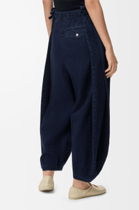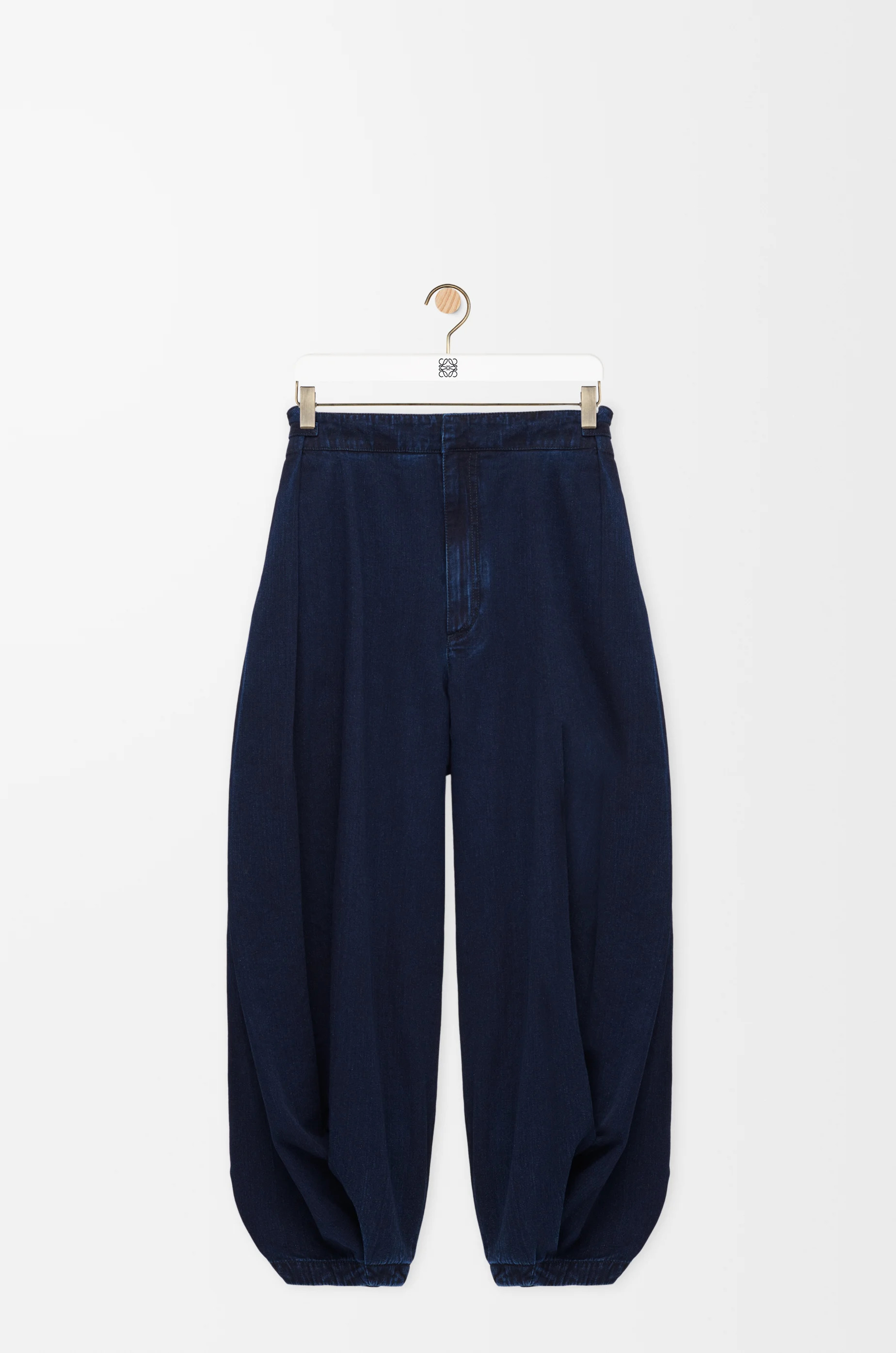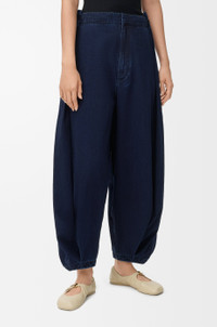 Jeans in lightweight washed cotton denim featuring a draped construction with fixed tabs at the waist. - Relaxed fit, regular length - Mid waist, loose leg - Concealed zip fly - Seam pockets, buttoned rear flap pocket Colour: Dark Indigo Main material: Cotton Weight: 0.8 kg Made in: Italy Materials & care Main Material: 100% cotton