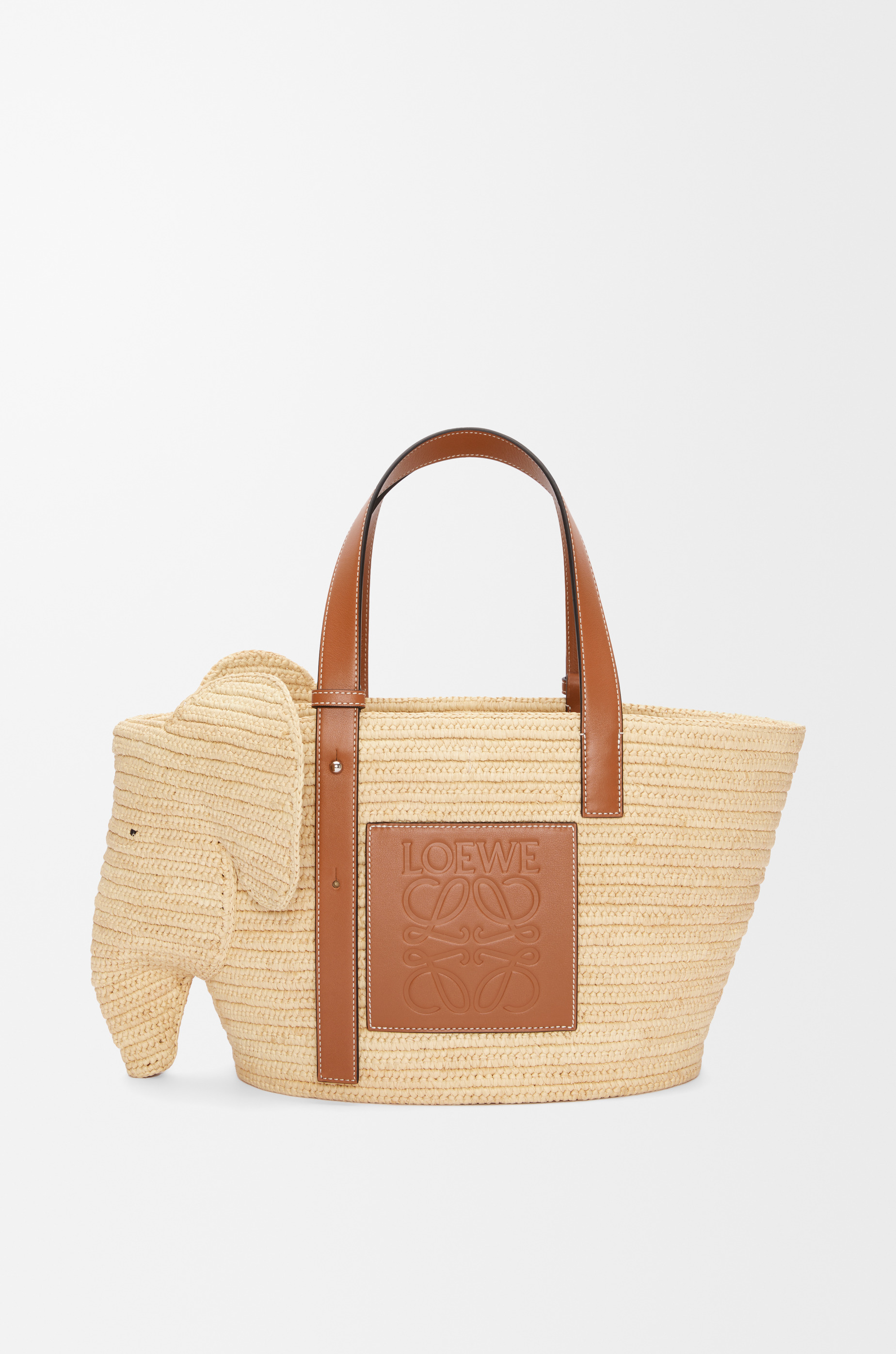 The Elephant Basket is a hybrid bag crafted in raffia that combines the distinctive silhouette of the LOEWE basket bag with an elephant’s head. This medium version is made in Spain using raffia leaves that have been cultivated, harvested, sun-dried and handwoven by artisans in Madagascar. - Shoulder or top handle carry - Calfskin tie closure - Unlined - Embossed LOEWE Anagram patch Details - Colour : Natural/Tan - Metallic colour : Palladium - Main material : Raffia/Calf - Handle drop : 18 - 22 cm - Weight : 0.64 kg - Height (cm) : 23.5 - Width (cm) : 42 - Depth (cm) : 20 - Height (inch) : 9.3 - Width (inch) : 16.5 - Depth (inch) : 7.9 - Model ID : A546T21X01 - CIL : - 0010574796 - Made in : Spain