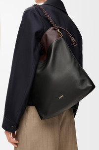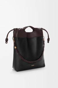The Flamenco purse tote is a functional and soft bag with a vertical shape, historical knot drawstrings, and a tonal donut chain that matches its contrast top. This version is crafted in mellow nappa lambskin. - Shoulder, crossbody or hand carry - Top handles, detachable and adjustable leather strap - Detachable donut chain with an Anagram Pebble - Magnetic closure - Suede lining - Gold or silver embossed LOEWE Colour: Black/Dark Chestnut Metallic colour: Gold Main material: Bicolour Mellow Nappa Lambskin Strap length: 61 / 73 - 126 cm Strap drop: 25 / 30 - 57 cm Handle drop: 7 cm Weight: 0.67 kg Height: 38 cm Width: 29 cm Depth: 9 cm Made in: Spain