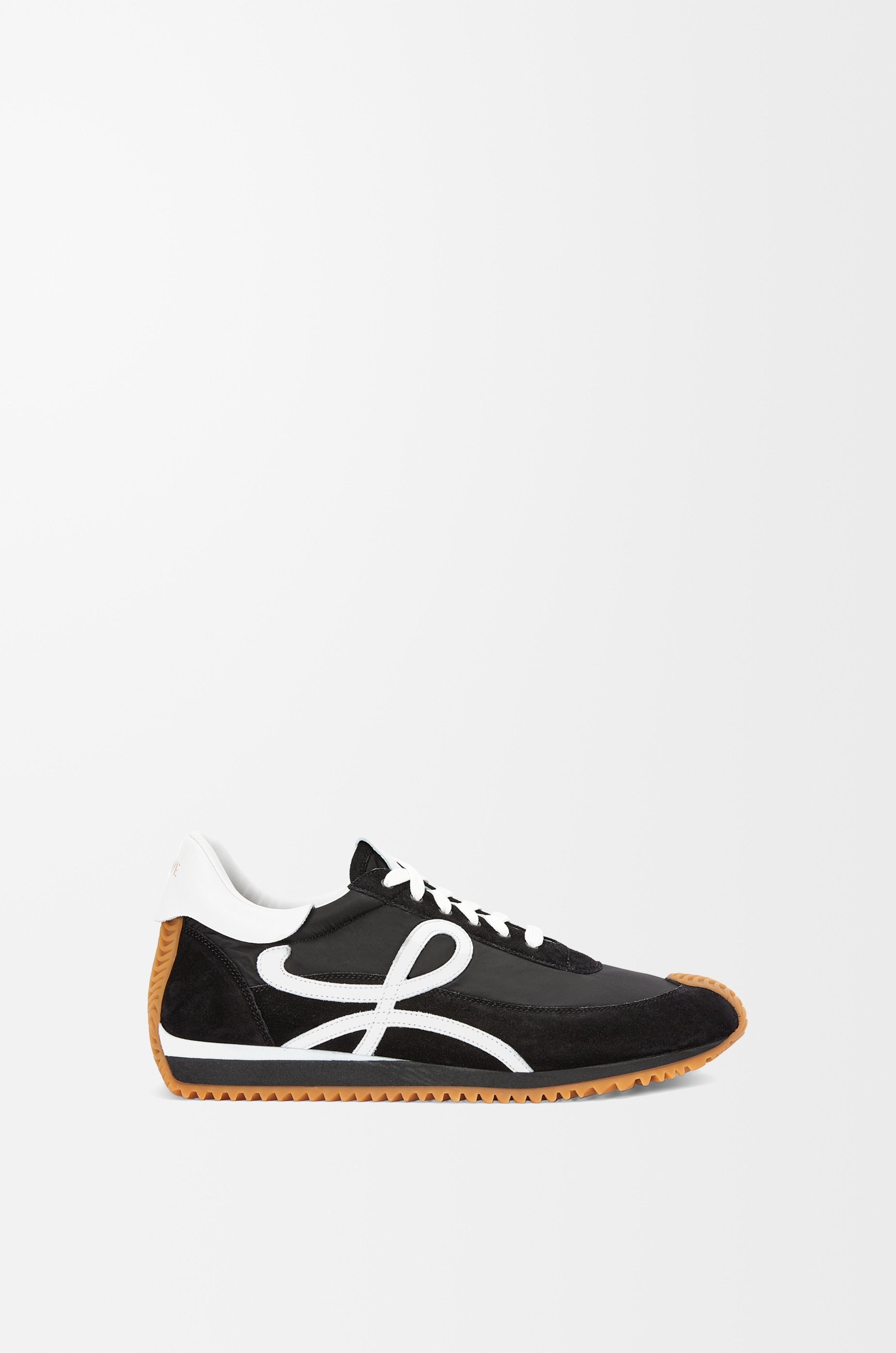 Lace-up runner sneaker in calfskin and nylon, featuring an L monogram on the quarter - The textured honey-coloured rubber outsole extends to the toe-cap and on to the back of the heel - Gold embossed LOEWE on the backtab Details - Colour: Black/White - Main material: Nylon/Suede - Heel height: 2.5 - Weight: 1.0 kg - Model ID: L815282X88 - Made in: Italy